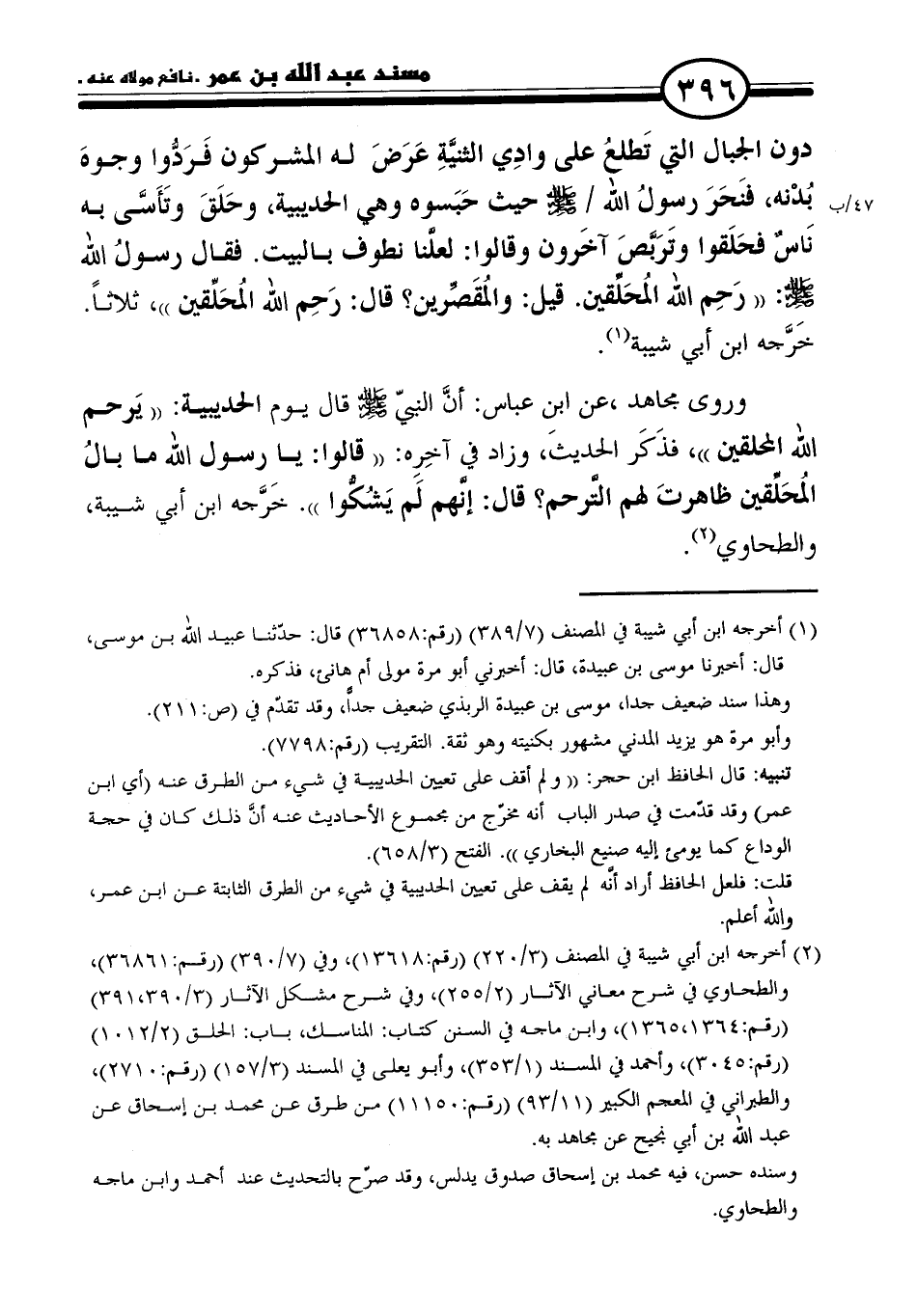 (٢) أخرجه ابن أبي شيبة في المصنف (٣/ ٢٢٠) (رقم: ١٣٦١٨)، وفي (٧/ ٣٩٠) (رقم: ٣٦٨٦١)، والطحاوي في شرح معاني الآثار (٢/ ٢٥٥)، وفي شرح مشكل الآثار (٣/ ٣٩٠، ٣٩١) (رقم: ١٣٦٤، ١٣٦٥)، وابن ماجه في السنن كتاب: المناسك، باب: الحلق (٢/ ١٠١٢) (رقم: ٣٠٤٥)، وأحمد في المسند (١/ ٣٥٣)، وأبو يعلى في المسند (٣/ ١٥٧) (رقم: ٢٧١٠)، والطبراني في المعجم الكبير (١١/ ٩٣) (رقم: ١١١٥٠) من طرق عن محمَّد بن إسحاق عن عبد الله بن أبي نجيح عن مجاهد به.