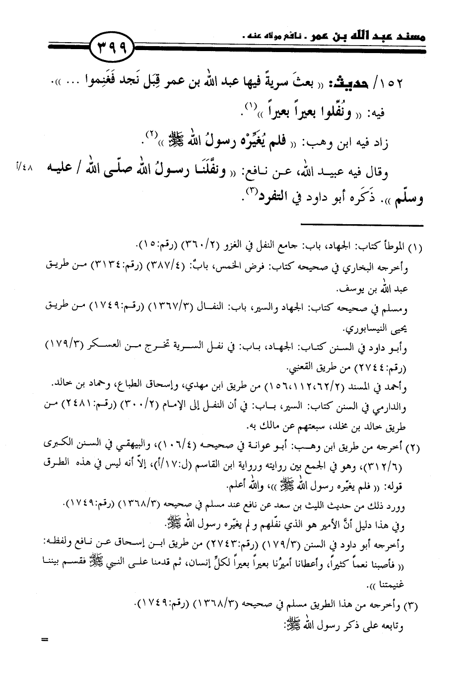 ١٥٢ / حديث: "بعثَ سريةً فيها عبد الله بن عمر قِبَل نَجد فَغَنِموا ... ".