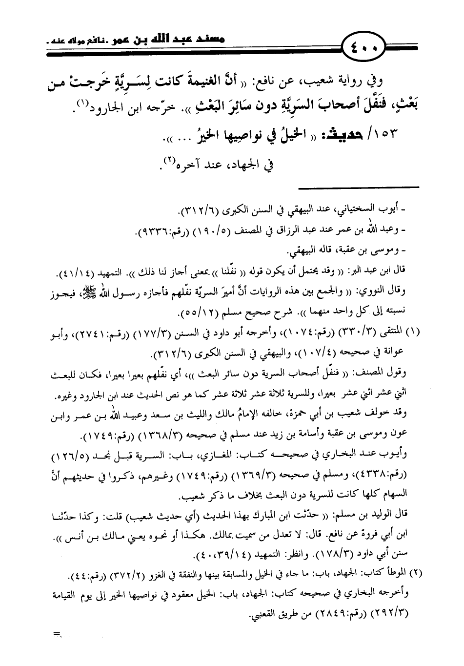 وفي رواية شعيب، عن نافع: "أنَّ الغنيمةَ كانت لِسَرِيةٍ خَرجتْ من بَعْثٍ، فنَفلَ أصحابَ السَرِيةِ دون سائِرَ البَعْثِ". خرّجه ابن الجارود (١).