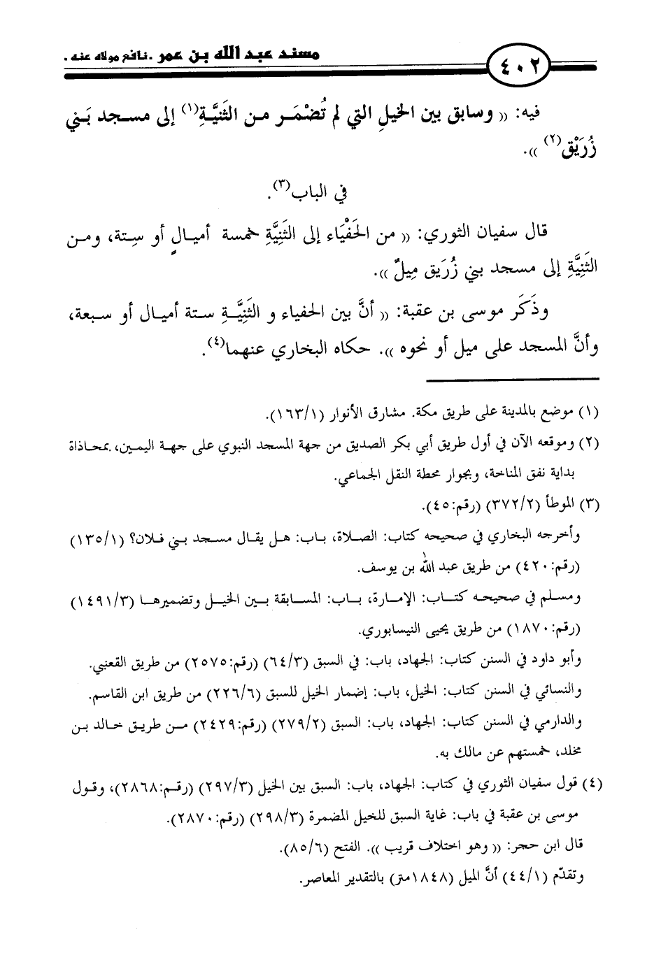 فيه: "وسابق بين الخيلِ التي لم تُضْمَر من الثَنيَّةِ (١) إلى مسجد بَنيْ زُرَيْق (٢) ".
