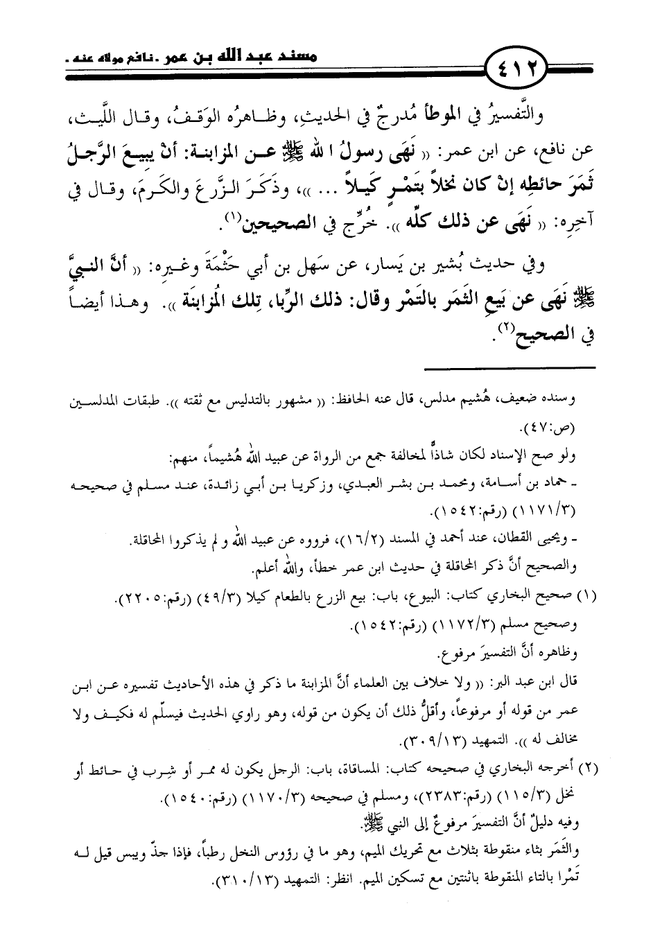والتَّفسيرُ في الموطأ مُدرجٌ في الحديث، وظاهرُه الوَقفُ، وقال اللَّيث، عن نافع، عن ابن عمر: "نَهَى رسولُ الله - صلى الله عليه وسلم - عن المزابنة: أن يبيعَ الرَّجلُ ثَمَرَ حائطِه إن كان نخلًا بتَمْرٍ كَيلًا ... "، وذَكَرَ الزرعَ والكَرَمَ، وقال في آخِرِه: "نَهَى عن ذلك كلِّه". خُرّج في الصحيحين (١).