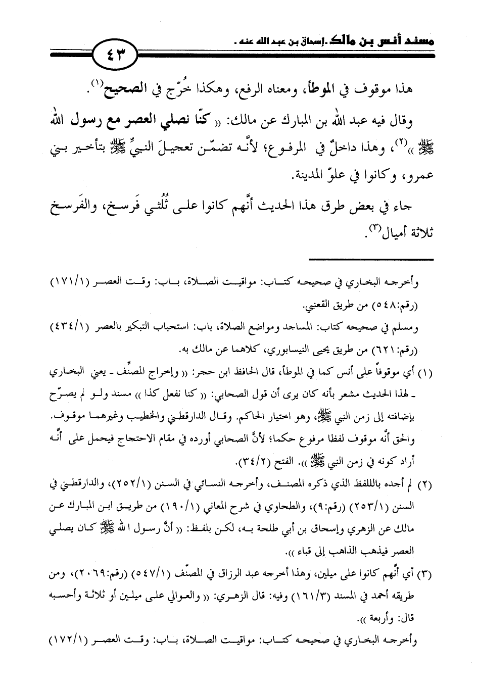 (٣) أي أنَّهم كانوا على ميلين، وهذا أخرجه عبد الرزاق في المصنف (١/ ٥٤٧) (رقم: ٢٠٦٩)، ومن طريقه أحمد في المسند (٣/ ١٦١) وفيه: قال الزهري: "والعوالي على ميلين أو ثلاثة وأحسبه قال: وأربعة".