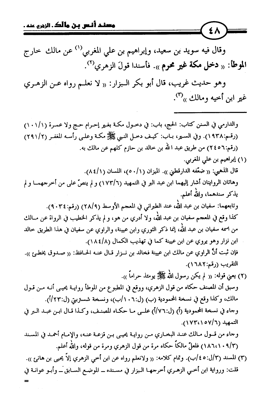 = والدارمي في السنن كتاب: الحج، باب: في دخول مكة بغير إحرام حج ولا عمرة (١/ ١٠١) (رقم: ١٩٣٨). وفي السير، باب: كيف دخل النبي - صلى الله عليه وسلم - مكة وعلى رأسه المغفر (٢/ ٢٩١) (رقم: ٢٤٥٦) من طريق عبد الله بن خالد بن حازم كلهم عن مالك به.