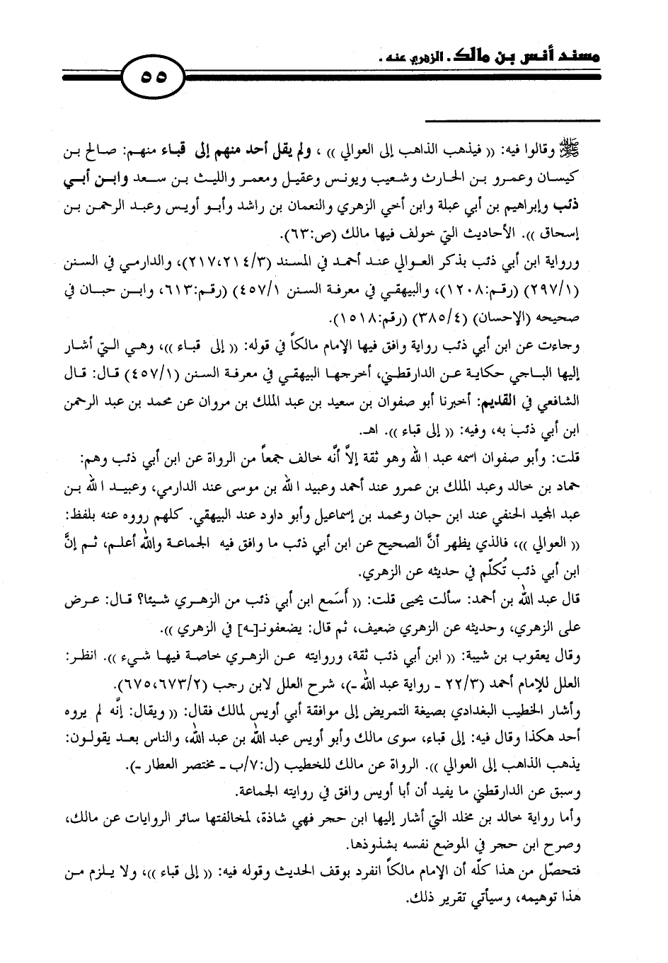 = - صلى الله عليه وسلم - وقالوا فيه: "فيذهب الذاهب إلى العوالي"، ولم يقل أحد منهم إلى قباء منهم: صالح بن كيسان وعمرو بن الحارث وشعيب ويونس وعقيل ومعمر والليث بن سعد وابن أبي ذئب وإبراهيم بن أبي عبلة وابن أخي الزهري والنعمان بن راشد وأبو أويس وعبد الرحمن بن إسحاق". الأحاديث التي خولف فيها مالك (ص: ٦٣).