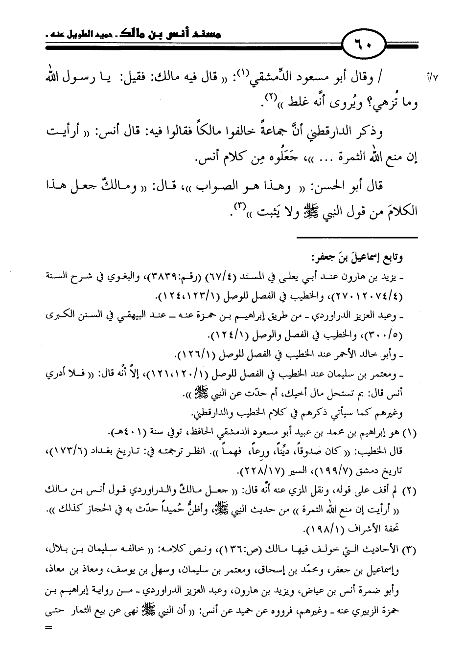 (٢) لم أقف على قوله، ونقل المزي عنه أنه قال: "جعل مالكٌ والدراوردي قول أنس بن مالك "أرأيت إن منع الله الثمرة" من حديث النبي - صلى الله عليه وسلم -، وأظنُّ حُميدًا حدَّث به في الحجاز كذلك". تحفة الأشراف (١/ ١٩٨).