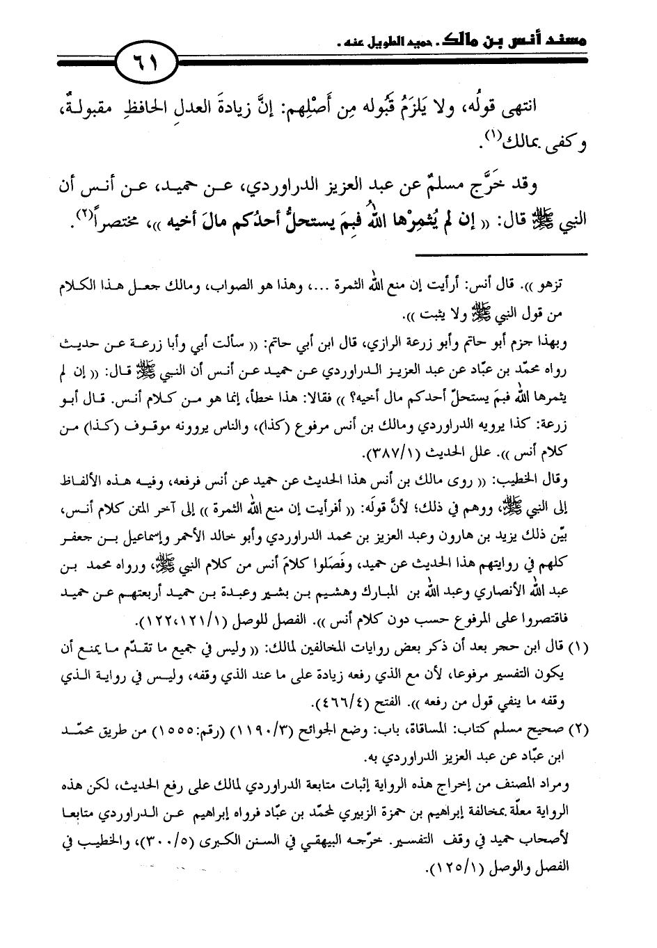 وبهذا جزم أبو حاتم وأبو زرعة الرازي، قال ابن أبي حاتم: "سألت أبي وأبا زرعة عن حديث رواه محمّد بن عبّاد عن عبد العزيز الدراوردي عن حميد عن أنس أن النبي - صلى الله عليه وسلم - قال: "إن لم يثمرها الله فبمَ يستحلّ أحدكم مال أخيه؟ " فقالا: هذا خطأ، إنما هو من كلام أنس. قال أبو زرعة: كذا يرويه الدراوردي ومالك بن أنس مرفوع (كذا)، والناس يروونه موقوف (كذا) من كلام أنس". علل الحديث (١/ ٣٨٧).