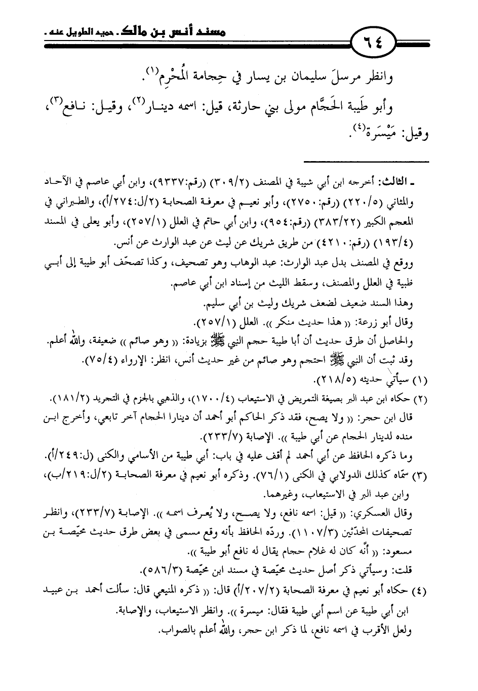 (٢) حكاه ابن عبد البر بصيغة التمريض في الاستيعاب (٤/ ١٧٠٠)، والذهبي بالجزم في التجريد (٢/ ١٨١). قال ابن حجر: "ولا يصح، فقد ذكر الحاكم أبو أحمد أن دينارا احجام آخر تابعي، وأخرج ابن منده لدينار الحجام عن أبي طيبة". الإصابة (٧/ ٢٣٣).