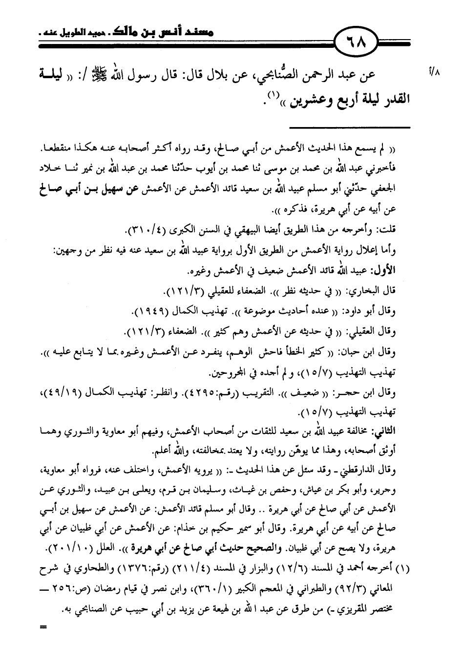 عن عبد الرحمن الصُّنابحي، عن بلال قال: قال رسول الله - صلى الله عليه وسلم -: "ليلة لقدر ليلة أربع وعشرين" (١).