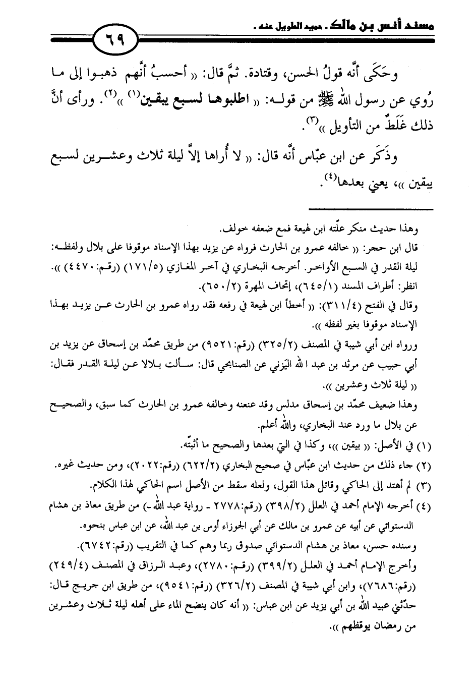 قال ابن حجر: "خالفه عمرو بن الحارث فرواه عن يزيد بهذا الإسناد موقوفا على بلال ولفظه: ليلة القدر في السبع الأواخر. أخرجه البخاري في آخر المغازي (٥/ ١٧١) (رقم: ٤٤٧٠) ". انظر: أطراف المسند (٦٤٥/ ١)، إتحاف المهرة (٢/ ٦٥٠).