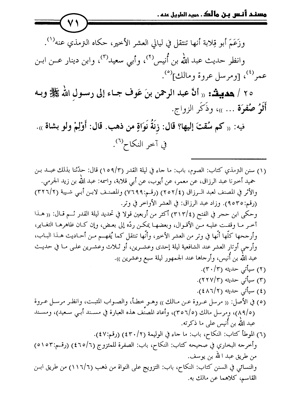 ٢٥/ حديث: "أن عبد الرحمن بنَ عَوف جاء إلى رسولِ الله - صلى الله عليه وسلم - وبه أَثَرُ صُفرَة. . . "، وذَكَر الزواج.