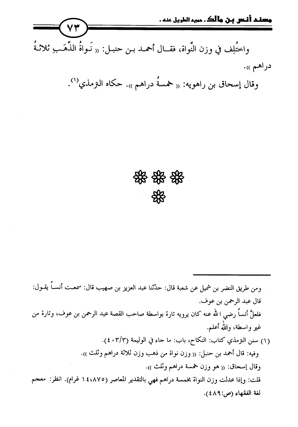 وفيه: قال أحمد بن حنبل: "وزن نواة من ذهب وزن ثلاثة دراهم وثلث".