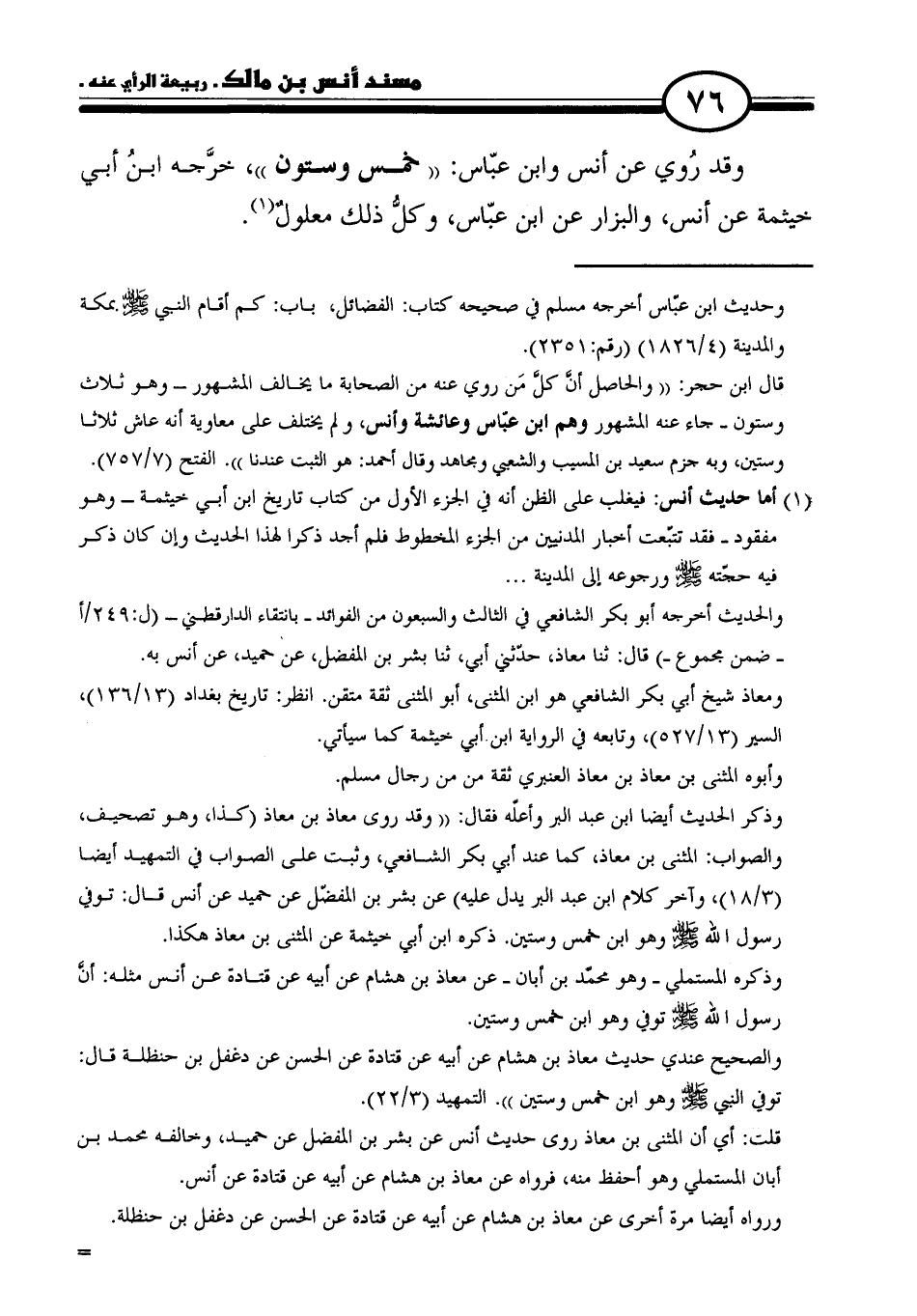 (١) أما حديث أنس: فيغلب على الظن أنه في الجزء الأول من كتاب تاريخ ابن أبي خيثمة -وهو مفقود- فقد تتبّعت أخبار المدنيين من الجزء المخطوط فلم أجد ذكرا لهذا الحديث وإن كان ذكر فيه حجّته - صلى الله عليه وسلم - ورجوعه إلى المدينة. . .