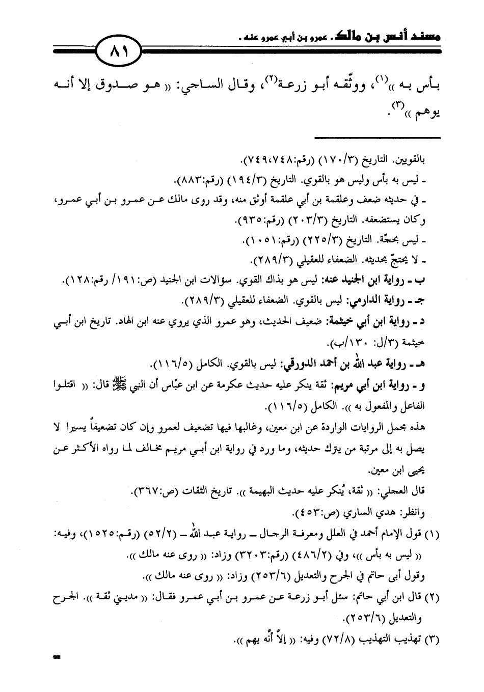 د- رواية ابن أبي خيثمة: ضعيف الحديث، وهو عمرو الذي يروي عنه ابن الهاد. تاريخ ابن أبي خيثمة (٣/ ل: ١٣٠/ ب).
