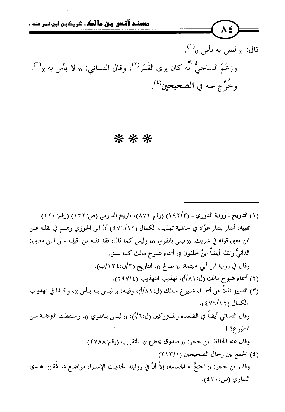 تنبيه: أشار بشار عوّاد في حاشية تهذيب الكمال (١٢/ ٤٧٦) أنَّ ابن الجوزي وهم في نقله عن ابن معين قوله في شريك: "ليس بالقوي"، وليس كما قال، فقد نقله من قبلِه عن ابن معين: الدانيُّ ونقله أيضًا ابنُ خلفون في أسماء شيوخ مالك كما سبق.