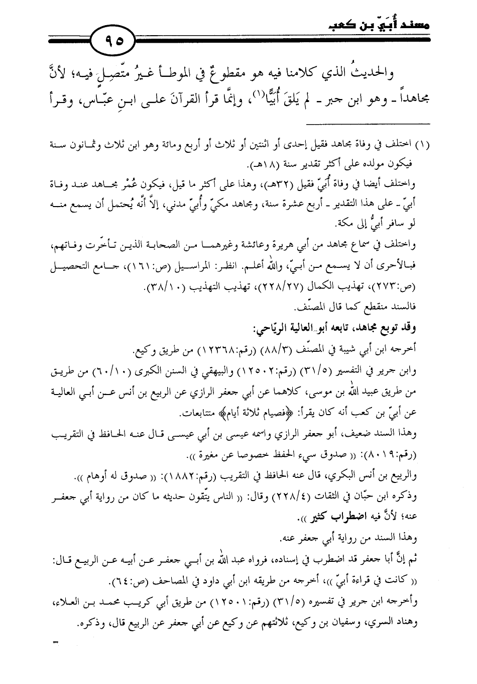 واختلف في سماع مجاهد من أبي هريرة وعائشة وغيرهما من الصحابة الذين تأخرت وفاتهم، فبالأحرى أن لا يسمع من أبيّ، والله أعلم. انظر: المراسيل (ص: ١٦١)، جامع التحصيل (ص: ٢٧٣)، تهذيب الكمال (٢٧/ ٢٢٨)، تهذيب التهذيب (١٠/ ٣٨).