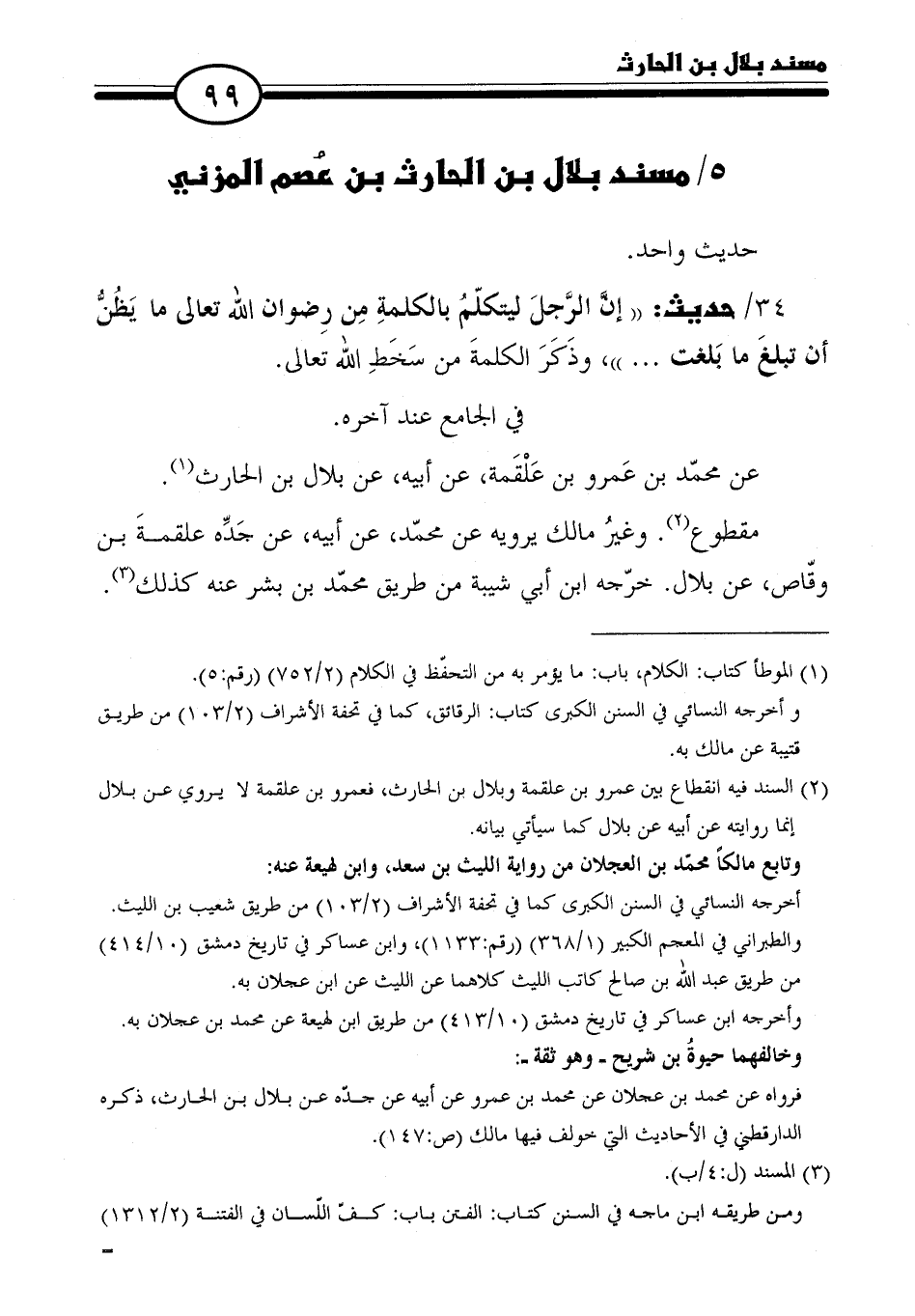 (٢) المسند فيه انقطاع بين عمرو بن علقمة وبلال بن الحارث، فعمرو بن علقمة لا يروي عن بلال إنما روايته عن أبيه عن بلال كما سيأتي بيانه.