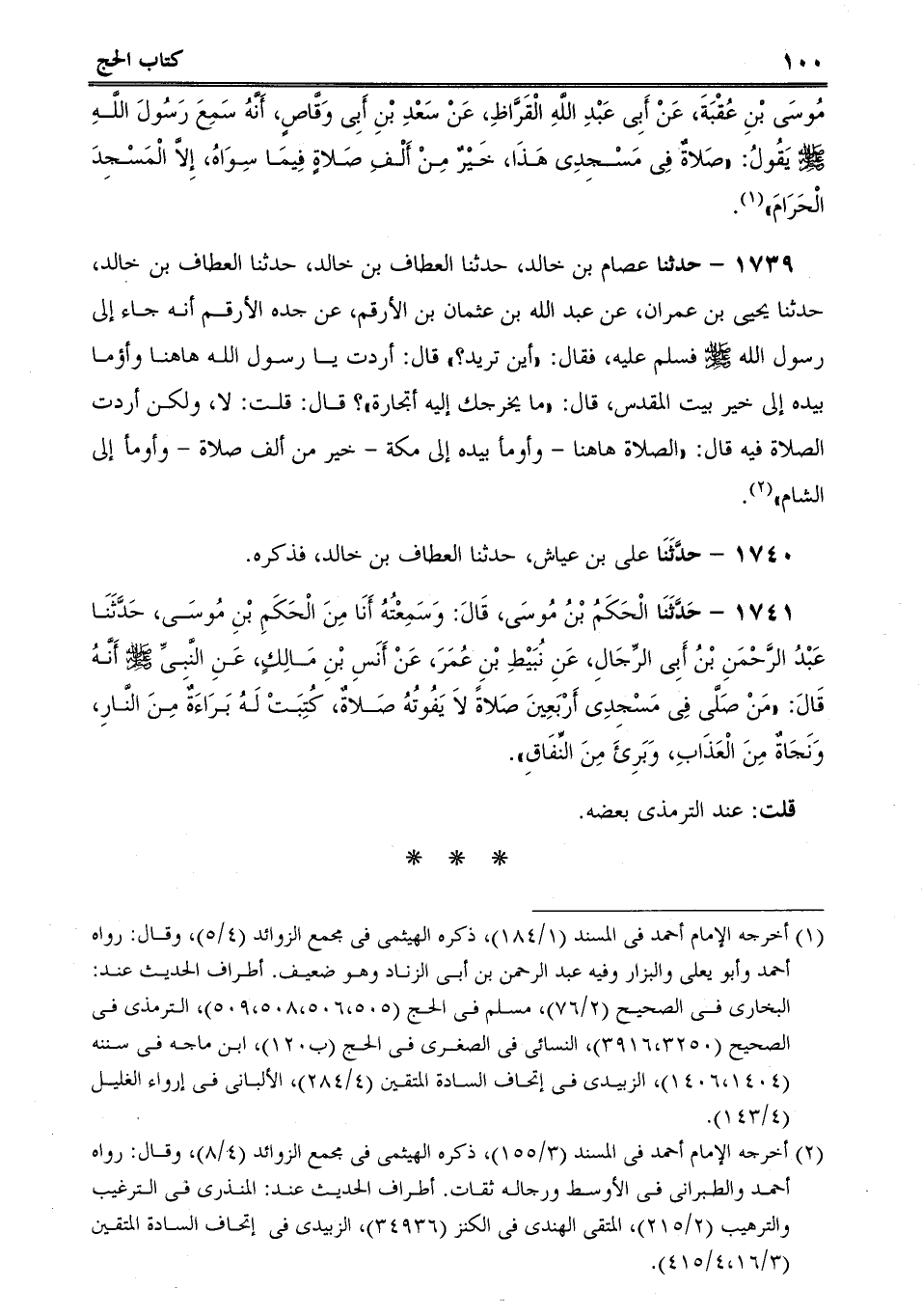 1739 - حدثنا عصام بن خالد، حدثنا العطاف بن خالد، حدثنا العطاف بن خالد، حدثنا يحيى بن عمران، عن عبد الله بن عثمان بن الأرقم، عن جده الأرقم أنه جاء إلى رسول الله صلى الله عليه وسلم فسلم عليه، فقال: "أين تريد؟ قال: أردت يا رسول الله هاهنا وأؤما بيده إلى خير بيت المقدس، قال: "ما يخرجك إليه أتجارة؟ قال: قلت: لا، ولكن أردت الصلاة فيه قال: "الصلاة هاهنا - وأومأ بيده إلى مكة - خير من ألف صلاة - وأومأ إلى الشام.