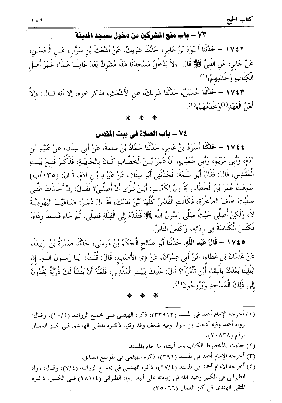 1744 - حَدَّثَنَا أَسْوَدُ بْنُ عَامِرٍ، حَدَّثَنَا حَمَّادُ بْنُ سَلَمَةَ، عَنْ أَبِى سِنَانٍ، عَنْ عُبَيْدِ بْنِ آدَمَ، وَأَبِى مَرْيَمَ، وَأَبِى شُعَيْبٍ، أَنَّ عُمَرَ بْنَ الْخَطَّابِ كَانَ بِالْجَابِيَةِ، فَذَكَرَ فَتْحَ بَيْتِ الْمَقْدِسِ، قَالَ: فَقَالَ أَبُو سَلَمَةَ: فَحَدَّثَنِى أَبُو سِنَانٍ، عَنْ عُبَيْدِ بْنِ آدَمَ، قَالَ: سَمِعْتُ عُمَرَ بْنَ الْخَطَّابِ يَقُولُ لِكَعْبٍ: أَيْنَ تُرَى أَنْ أُصَلِّيَ؟ فَقَالَ: إِنْ أَخَذْتَ عَنِّى صَلَّيْتَ خَلْفَ الصَّخْرَةِ، فَكَانَتِ الْقُدْسُ كُلُّهَا بَيْنَ يَدَيْكَ، فَقَالَ عُمَرُ: ضَاهَيْتَ الْيَهُودِيَّةَ لاَ، وَلَكِنْ أُصَلِّى حَيْثُ صَلَّى رَسُولُ اللَّهِ صلى الله عليه وسلم فَتَقَدَّمَ إِلَى الْقِبْلَةِ فَصَلَّى، ثُمَّ جَاءَ فَبَسَطَ رِدَاءَهُ فَكَنَسَ الْكُنَاسَةَ فِى رِدَائِهِ، وَكَنَسَ النَّاسُ.