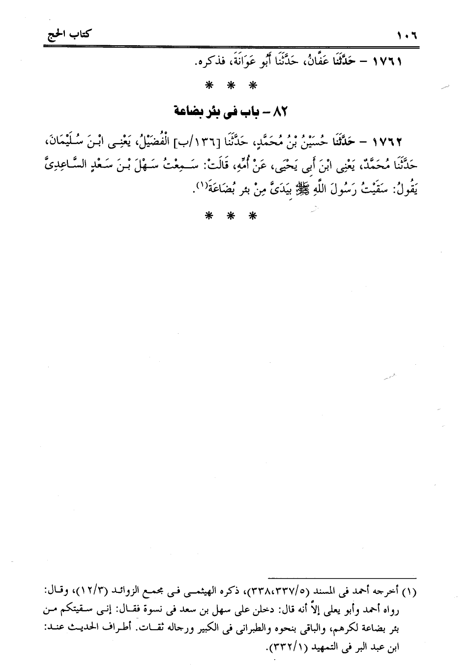 1762 - حَدَّثَنَا حُسَيْنُ بْنُ مُحَمَّدٍ، حَدَّثَنَا الْفُضَيْلُ، يَعْنِى ابْنَ سُلَيْمَانَ، حَدَّثَنَا مُحَمَّدٌ، يَعْنِى ابْنَ أَبِى يَحْيَى، عَنْ أُمِّهِ، قَالَتْ: سَمِعْتُ سَهْلَ بْنَ سَعْدٍ السَّاعِدِىَّ يَقُولُ: سَقَيْتُ رَسُولَ اللَّهِ صلى الله عليه وسلم بِيَدَىَّ مِنْ بئر بُضَاعَةَ.