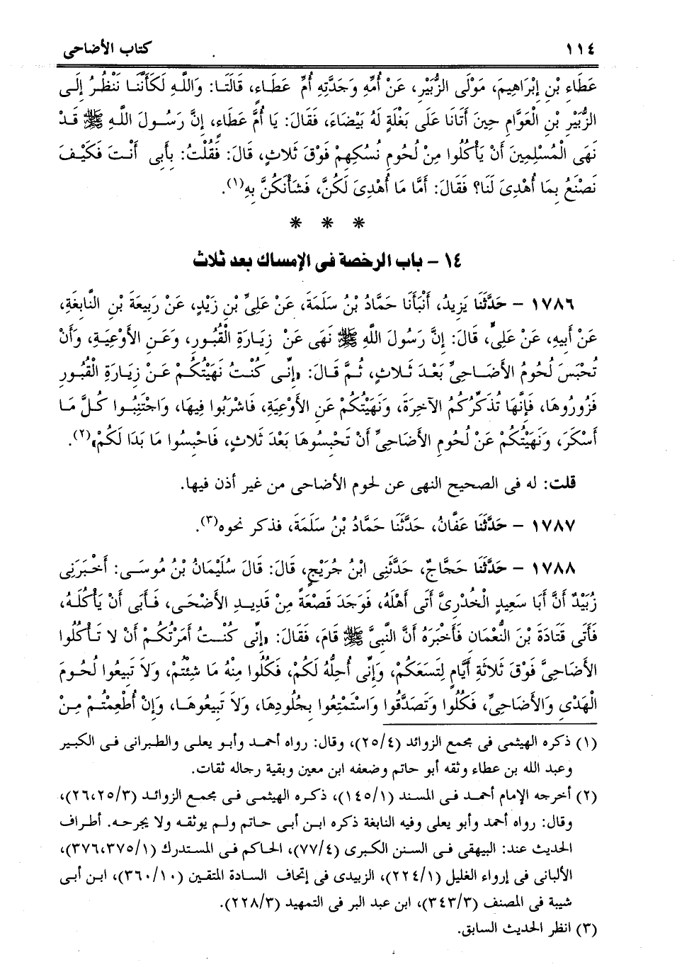1786 - حَدَّثَنَا يَزِيدُ، أَنْبَأَنَا حَمَّادُ بْنُ سَلَمَةَ، عَنْ عَلِىِّ بْنِ زَيْدٍ، عَنْ رَبِيعَةَ بْنِ النَّابِغَةِ، عَنْ أَبِيهِ، عَنْ عَلِىٍّ، قَالَ: إِنَّ رَسُولَ اللَّهِ صلى الله عليه وسلم نَهَى عَنْ زِيَارَةِ الْقُبُورِ، وَعَنِ الأَوْعِيَةِ، وَأَنْ تُحْبَسَ لُحُومُ الأَضَاحِىِّ بَعْدَ ثَلاثٍ، ثُمَّ قَالَ: "إِنِّى كُنْتُ نَهَيْتُكُمْ عَنْ زِيَارَةِ الْقُبُورِ فَزُورُوهَا، فَإِنَّهَا تُذَكِّرُكُمُ الآخِرَةَ، وَنَهَيْتُكُمْ عَنِ الأَوْعِيَةِ، فَاشْرَبُوا فِيهَا، وَاجْتَنِبُوا كُلَّ مَا أَسْكَرَ، وَنَهَيْتُكُمْ عَنْ لُحُومِ الأَضَاحِىِّ أَنْ تَحْبِسُوهَا بَعْدَ ثَلاثٍ، فَاحْبِسُوا مَا بَدَا لَكُمْ.
