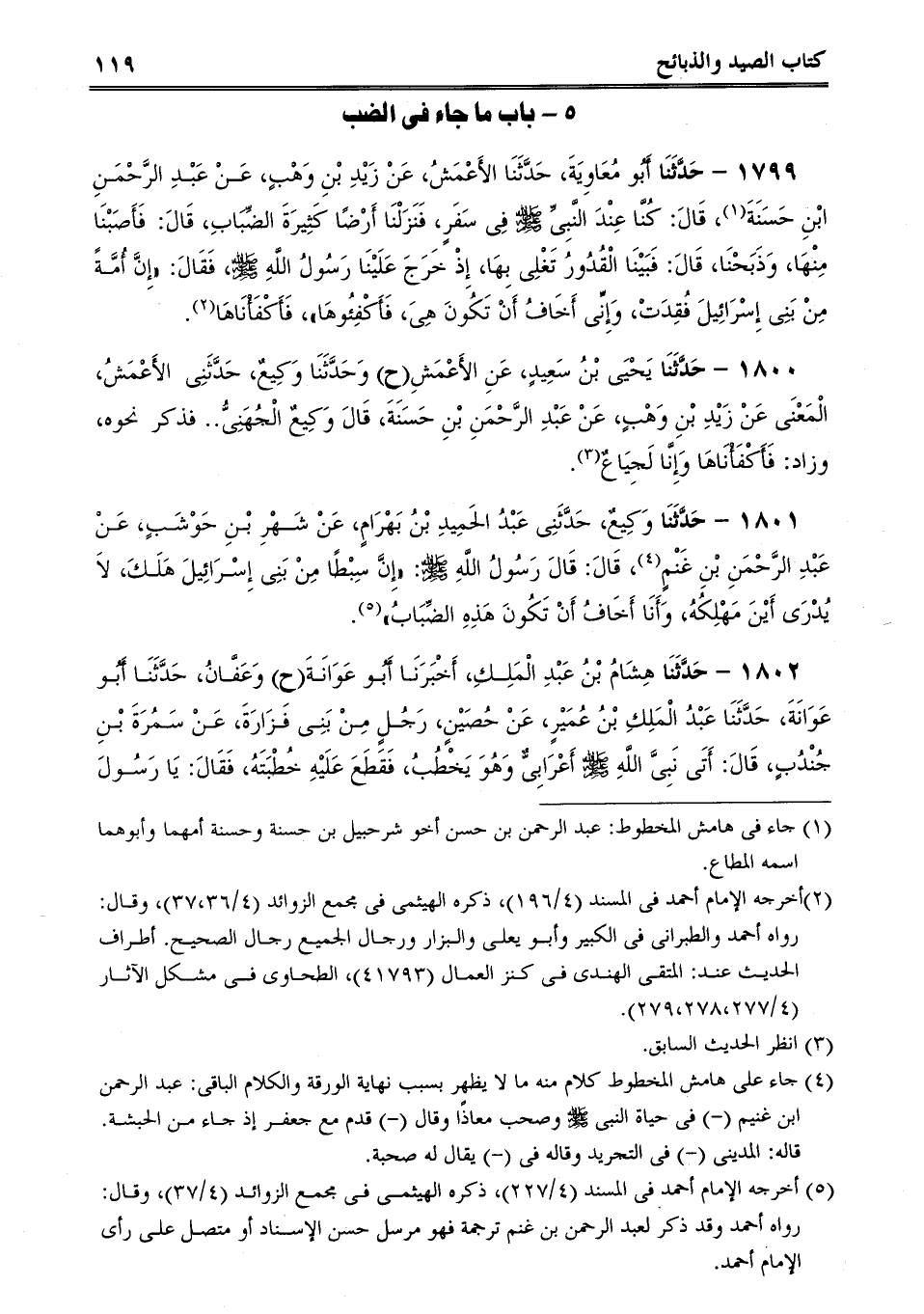 1799 - حَدَّثَنَا أَبُو مُعَاوِيَةَ، حَدَّثَنَا الأَعْمَشُ، عَنْ زَيْدِ بْنِ وَهْبٍ، عَنْ عَبْدِ الرَّحْمَنِ ابْنِ حَسَنَةَ، قَالَ: كُنَّا عِنْدَ النَّبِىِّ صلى الله عليه وسلم فِى سَفَرٍ، فَنَزَلْنَا أَرْضًا كَثِيرَةَ الضِّبَابِ، قَالَ: فَأَصَبْنَا مِنْهَا، وَذَبَحْنَا، قَالَ: فَبَيْنَا الْقُدُورُ تَغْلِى بِهَا، إِذْ خَرَجَ عَلَيْنَا رَسُولُ اللَّهِ صلى الله عليه وسلم، فَقَالَ: "إِنَّ أُمَّةً مِنْ بَنِى إِسْرَائِيلَ فُقِدَتْ، وَإِنِّى أَخَافُ أَنْ تَكُونَ هِىَ، فَأَكْفِئُوهَا، فَأَكْفَأْنَاهَا.