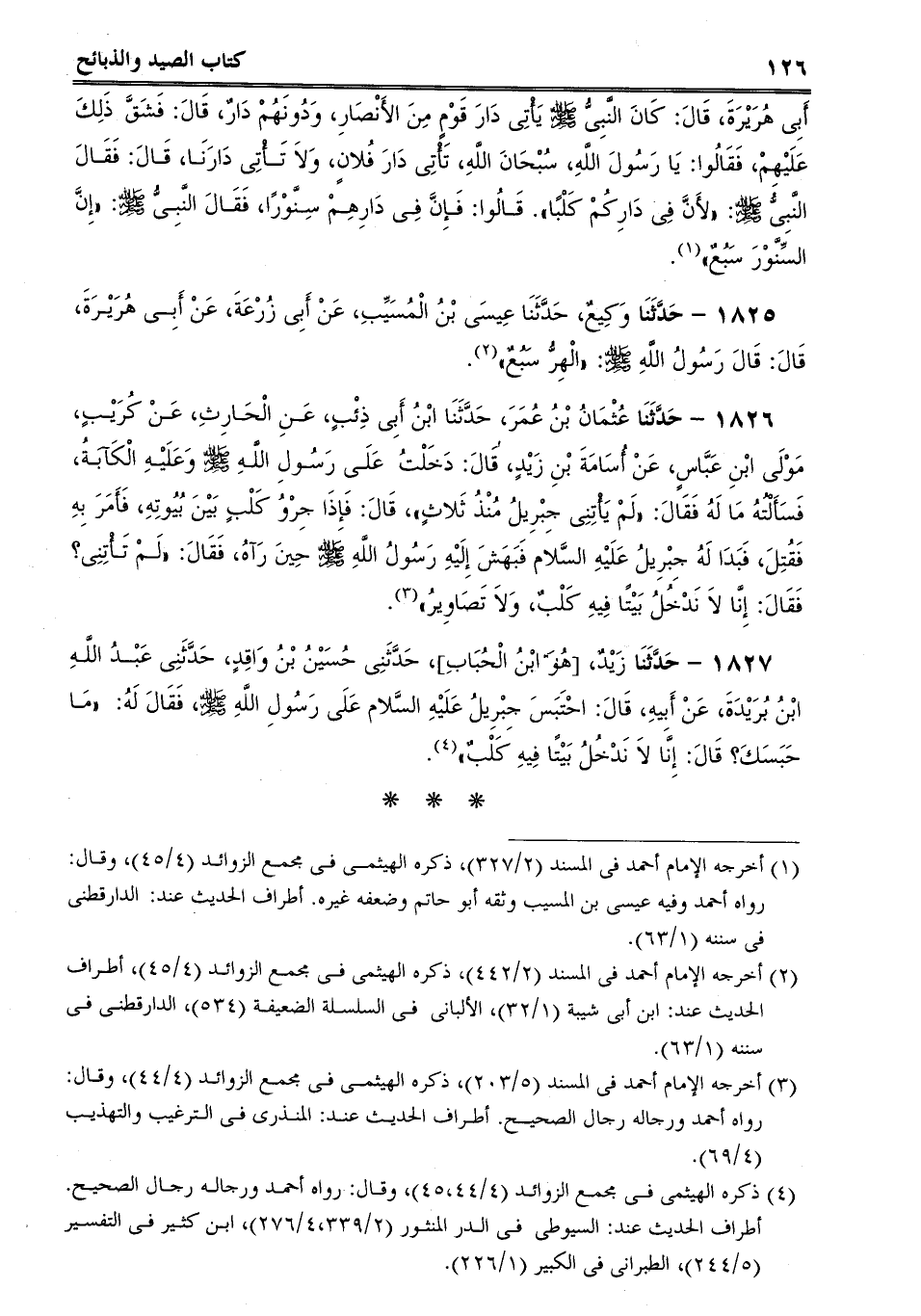 1826 - حَدَّثَنَا عُثْمَانُ بْنُ عُمَرَ، حَدَّثَنَا ابْنُ أَبِى ذِئْبٍ، عَنِ الْحَارِثِ، عَنْ كُرَيْبٍ، مَوْلَى ابْنِ عَبَّاسٍ، عَنْ أُسَامَةَ بْنِ زَيْدٍ، قَالَ: دَخَلْتُ عَلَى رَسُولِ اللَّهِ صلى الله عليه وسلم وَعَلَيْهِ الْكَآبَةُ، فَسَأَلْتُهُ مَا لَهُ فَقَالَ: "لَمْ يَأْتِنِى جِبْرِيلُ مُنْذُ ثَلاثٍ، قَالَ: فَإِذَا جِرْوُ كَلْبٍ بَيْنَ بُيُوتِهِ، فَأَمَرَ بِهِ فَقُتِلَ، فَبَدَا لَهُ جِبْرِيلُ عَلَيْهِ السَّلام فَبَهَشَ إِلَيْهِ رَسُولُ اللَّهِ صلى الله عليه وسلم حِينَ رَآهُ، فَقَالَ: "لَمْ تَأْتِنِى؟ فَقَالَ: إِنَّا لاَ نَدْخُلُ بَيْتًا فِيهِ كَلْبٌ، وَلاَ تَصَاوِيرُ.
