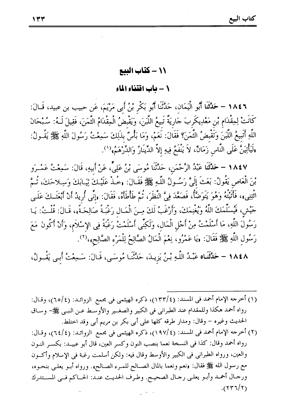 1846 - حَدَّثَنَا أَبُو الْيَمَانِ، حَدَّثَنَا أَبُو بَكْرِ بْنُ أَبِى مَرْيَمَ، عَن حبيب بن عبيد، قَالَ: كَانَتْ لِمِقْدَامِ بْنِ مَعْدِيكَرِبَ جَارِيَةٌ تَبِيعُ اللَّبَنَ، وَيَقْبِضُ الْمِقْدَامُ الثَّمَنَ، فَقِيلَ لَهُ: سُبْحَانَ اللَّهِ أَتَبِيعُ اللَّبَنَ وَتَقْبِضُ الثَّمَنَ؟ فَقَالَ: نَعَمْ، وَمَا بَأْسٌ بِذَلِكَ سَمِعْتُ رَسُولَ اللَّهِ صلى الله عليه وسلم يَقُولُ: "لَيَأْتِيَنَّ عَلَى النَّاسِ زَمَانٌ، لاَ يَنْفَعُ فِيهِ إِلاَّ الدِّينَارُ وَالدِّرْهَمُ.