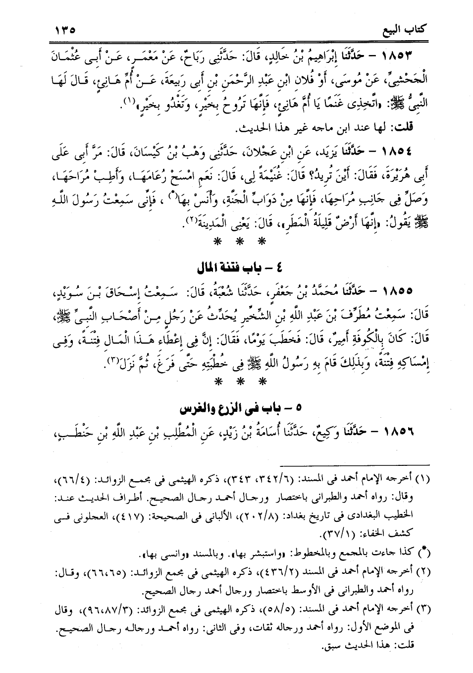 1853 - حَدَّثَنَا إِبْرَاهِيمُ بْنُ خَالِدٍ، قَالَ: حَدَّثَنِى رَبَاحٌ، عَنْ مَعْمَرٍ، عَنْ أَبِى عُثْمَانَ الْجَحْشِىِّ، عَنْ مُوسَى، أَوْ فُلانِ ابْنِ عَبْدِ الرَّحْمَنِ بْنِ أَبِى رَبِيعَةَ، عَنْ أُمِّ هَانِئٍ، قَالَ لَهَا النَّبِىُّ صلى الله عليه وسلم: "اتَّخِذِى غَنَمًا يَا أُمَّ هَانِئٍ، فَإِنَّهَا تَرُوحُ بِخَيْرٍ، وَتَغْدُو بِخَيْرٍ.