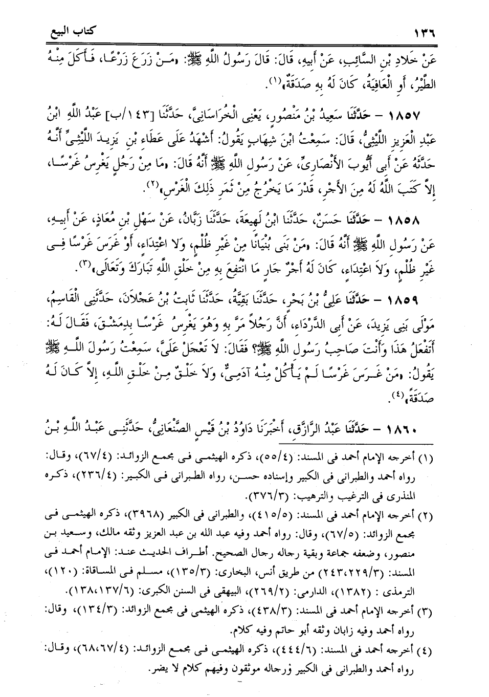 1857 - حَدَّثَنَا سَعِيدُ بْنُ مَنْصُورٍ، يَعْنِى الْخُرَاسَانِىَّ، حَدَّثَنَا عَبْدُ اللَّهِ ابْنُ عَبْدِ الْعَزِيزِ اللَّيْثِىُّ، قَالَ: سَمِعْتُ ابْنَ شِهَابٍ يَقُولُ: أَشْهَدُ عَلَى عَطَاءِ بْنِ يَزِيدَ اللَّيْثِىِّ أَنَّهُ حَدَّثَهُ عَنْ أَبِى أَيُّوبَ الأَنْصَارِىِّ، عَنْ رَسُولِ اللَّهِ صلى الله عليه وسلم أَنَّهُ قَالَ: "مَا مِنْ رَجُلٍ يَغْرِسُ غَرْسًا، إِلاَّ كَتَبَ اللَّهُ لَهُ مِنَ الأَجْرِ، قَدْرَ مَا يَخْرُجُ مِنْ ثَمَرِ ذَلِكَ الْغَرْسِ.