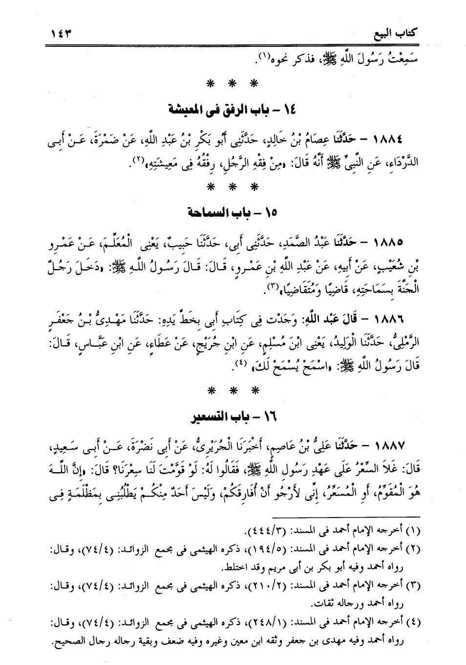 1886 - قَالَ عَبْد اللَّهِ: وَجَدْت فِى كِتَابِ أَبِى بِخَطِّ يَدِهِ: حَدَّثَنَا مَهْدِىُّ بْنُ جَعْفَرٍ الرَّمْلِىُّ، حَدَّثَنَا الْوَلِيدُ، يَعْنِى ابْنَ مُسْلِمٍ، عَنِ ابْنِ جُرَيْجٍ، عَنْ عَطَاءٍ، عَنِ ابْنِ عَبَّاسٍ، قَالَ: قَالَ رَسُولُ اللَّهِ صلى الله عليه وسلم: "اسْمَحْ يُسْمَحْ لَكَ.