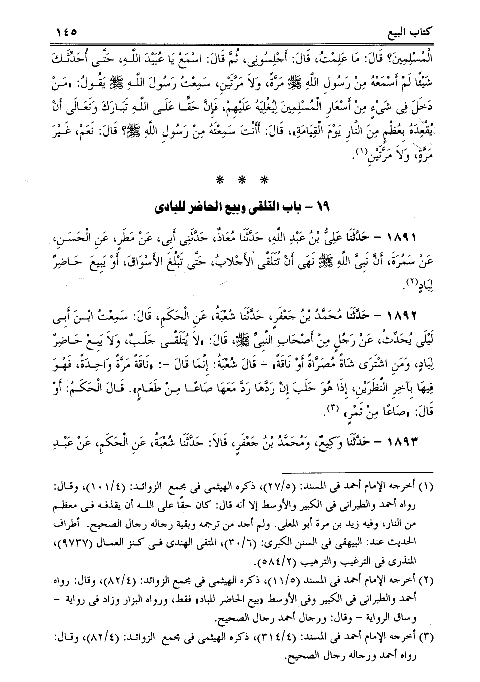 1891 - حَدَّثَنَا عَلِىُّ بْنُ عَبْدِ اللَّهِ، حَدَّثَنَا مُعَاذٌ، حَدَّثَنِى أَبِى، عَنْ مَطَرٍ، عَنِ الْحَسَنِ، عَنْ سَمُرَةَ، أَنَّ نَبِىَّ اللَّهِ صلى الله عليه وسلم نَهَى أَنْ تُتَلَقَّى الأَجْلابُ، حَتَّى تَبْلُغَ الأَسْوَاقَ، أَوْ يَبِيعَ حَاضِرٌ لِبَادٍ.