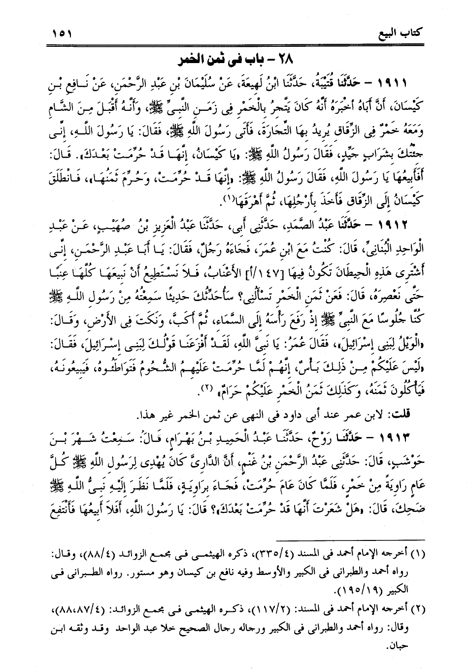 1912 - حَدَّثَنَا عَبْدُ الصَّمَدِ، حَدَّثَنِى أَبِى، حَدَّثَنَا عَبْدُ الْعَزِيزِ بْنُ صُهَيْبٍ، عَنْ عَبْدِ الْوَاحِدِ الْبُنَانِىِّ، قَالَ: كُنْتُ مَعَ ابْنِ عُمَرَ، فَجَاءَهُ رَجُلٌ، فَقَالَ: يَا أَبَا عَبْدِ الرَّحْمَنِ، إِنِّى أَشْتَرِى هَذِهِ الْحِيطَانَ تَكُونُ فِيهَا الأَعْنَابُ، فَلاَ نَسْتَطِيعُ أَنْ نَبِيعَهَا كُلَّهَا عِنَبًا حَتَّى نَعْصِرَهُ، قَالَ: فَعَنْ ثَمَنِ الْخَمْرِ تَسْأَلُنِى؟ سَأُحَدِّثُكَ حَدِيثًا سَمِعْتُهُ مِنْ رَسُولِ اللَّهِ صلى الله عليه وسلم كُنَّا جُلُوسًا مَعَ النَّبِىِّ صلى الله عليه وسلم إِذْ رَفَعَ رَأْسَهُ إِلَى السَّمَاءِ، ثُمَّ أَكَبَّ، وَنَكَتَ فِى الأَرْضِ، وَقَالَ: "الْوَيْلُ لِبَنِى إِسْرَائِيلَ، فَقَالَ عُمَرُ: يَا نَبِىَّ اللَّهِ، لَقَدْ أَفْزَعَنَا قَوْلُكَ لِبَنِى إِسْرَائِيلَ، فَقَالَ: "لَيْسَ عَلَيْكُمْ مِنْ ذَلِكَ بَأْسٌ، إِنَّهُمْ لَمَّا حُرِّمَتْ عَلَيْهِمُ الشُّحُومُ فَتَوَاطَئُوهُ، فَيَبِيعُونَهُ، فَيَأْكُلُونَ ثَمَنَهُ، وَكَذَلِكَ ثَمَنُ الْخَمْرِ عَلَيْكُمْ حَرَامٌ.
