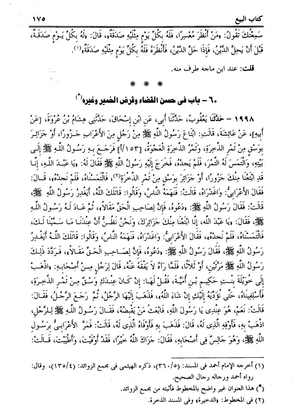 1998 - حَدَّثَنَا يَعْقُوبُ، حَدَّثَنَا أَبِى، عَنِ ابْنِ إِسْحَاقَ، حَدَّثَنِى هِشَامُ بْنُ عُرْوَةَ، [عَنْ أَبِيهِ] ، عَنْ عَائِشَةَ، قَالَتِ: ابْتَاعَ رَسُولُ اللَّهِ صلى الله عليه وسلم مِنْ رَجُلٍ مِنَ الأَعْرَابِ جَزُورًا، أَوْ جَزَائِرَ بِوَسْقٍ مِنْ تَمْرِ الذَّخِرَةِ، وَتَمْرُ الذَّخِرَةِ الْعَجْوَةُ، فَرَجَعَ بِهِ رَسُولُ اللَّهِ صلى الله عليه وسلم إِلَى بَيْتِهِ، وَالْتَمَسَ لَهُ التَّمْرَ، فَلَمْ يَجِدْهُ، فَخَرَجَ إِلَيْهِ رَسُولُ اللَّهِ صلى الله عليه وسلم فَقَالَ لَهُ: "يَا عَبْدَ اللَّهِ، إِنَّا قَدِ ابْتَعْنَا مِنْكَ جَزُورًا، أَوْ جَزَائِرَ بِوَسْقٍ مِنْ تَمْرِ الذَّخْرَةِ، فَالْتَمَسْنَاهُ، فَلَمْ نَجِدْهُ، قَالَ: فَقَالَ الأَعْرَابِىُّ: وَاغَدْرَاهُ، قَالَتْ: فَنَهَمَهُ النَّاسُ، وَقَالُوا: قَاتَلَكَ اللَّهُ، أَيَغْدِرُ رَسُولُ اللَّهِ صلى الله عليه وسلم، قَالَتْ: فَقَالَ رَسُولُ اللَّهِ صلى الله عليه وسلم: "دَعُوهُ، فَإِنَّ لِصَاحِبِ الْحَقِّ مَقَالاً، ثُمَّ عَادَ لَهُ رَسُولُ اللَّهِ صلى الله عليه وسلم، فَقَالَ: "يَا عَبْدَ اللَّه، إِنَّا ابْتَعْنَا مِنْكَ جَزَائِرَكَ، وَنَحْنُ نَظُنُّ أَنَّ عِنْدَنَا مَا سَمَّيْنَا لَكَ، فَالْتَمَسْنَاهُ، فَلَمْ نَجِدْهُ، فَقَالَ الأَعْرَابِىُّ: وَاغَدْرَاهُ، فَنَهَمَهُ النَّاسُ، وَقَالُوا: قَاتَلَكَ اللَّهُ أَيَغْدِرُ رَسُولُ اللَّهِ صلى الله عليه وسلم، فَقَالَ رَسُولُ اللَّهِ صلى الله عليه وسلم: "دَعُوهُ، فَإِنَّ لِصَاحِبِ الْحَقِّ مَقَالاً، فَرَدَّدَ ذَلِكَ رَسُولُ اللَّهِ صلى الله عليه وسلم مَرَّتَيْنِ، أَوْ ثَلاَثًا، فَلَمَّا رَآهُ لاَ يَفْقَهُ عَنْهُ، قَالَ لِرَجُلٍ مِنْ أَصْحَابِهِ: "اذْهَبْ إِلَى خُوَيْلَةَ بِنْتِ حَكِيمِ بْنِ أُمَيَّةَ، فَقُلْ لَهَا: إِنْ كَانَ عِنْدَكِ وَسْقٌ مِنْ تَمْرِ الذَّخِرَةِ،