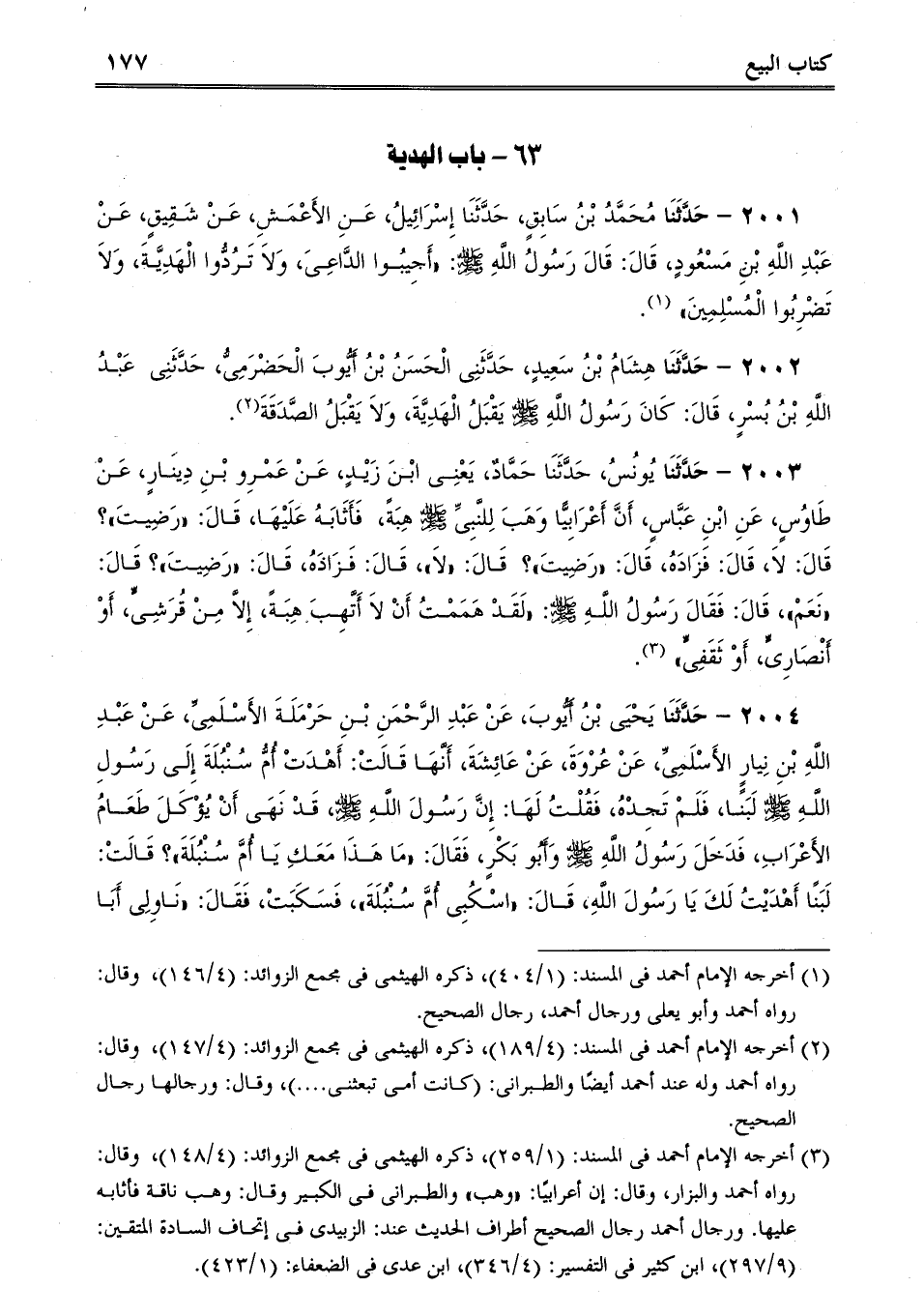 2003 - حَدَّثَنَا يُونُسُ، حَدَّثَنَا حَمَّادٌ، يَعْنِى ابْنَ زَيْدٍ، عَنْ عَمْرِو بْنِ دِينَارٍ، عَنْ طَاوُسٍ، عَنِ ابْنِ عَبَّاسٍ، أَنَّ أَعْرَابِيًّا وَهَبَ لِلنَّبِىِّ صلى الله عليه وسلم هِبَةً، فَأَثَابَهُ عَلَيْهَا، قَالَ: "رَضِيتَ؟ قَالَ: لاَ، قَالَ: فَزَادَهُ، قَالَ: "رَضِيتَ؟ قَالَ: "لاَ، قَالَ: فَزَادَهُ، قَالَ: "رَضِيتَ؟ قَالَ: "نَعَمْ، قَالَ: فَقَالَ رَسُولُ اللَّهِ صلى الله عليه وسلم: "لَقَدْ هَمَمْتُ أَنْ لاَ أَتَّهِبَ هِبَةً، إِلاَّ مِنْ قُرَشِىٍّ، أَوْ أَنْصَارِىٍّ، أَوْ ثَقَفِىٍّ.