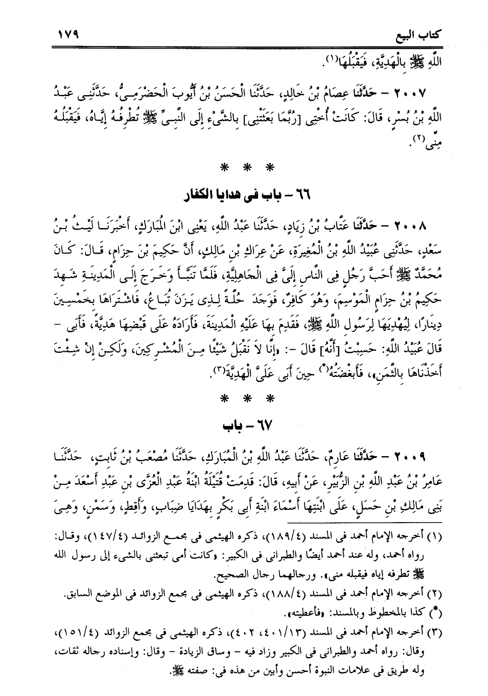 2008 - حَدَّثَنَا عَتَّابُ بْنُ زِيَادٍ، حَدَّثَنَا عَبْدُ اللَّهِ، يَعْنِى ابْنَ المُبَارَكٍ، أَخْبَرَنَا لَيْثُ بْنُ سَعْدٍ، حَدَّثَنِى عُبَيْدُ اللَّهِ بْنُ الْمُغِيرَةِ، عَنْ عِرَاكِ بْنِ مَالِكٍ، أَنَّ حَكِيمَ بْنَ حِزَامٍ، قَالَ: كَانَ مُحَمَّدٌ صلى الله عليه وسلم أَحَبَّ رَجُلٍ فِى النَّاسِ إِلَىَّ فِى الْجَاهِلِيَّةِ، فَلَمَّا تَنَبَّأَ وَخَرَجَ إِلَى الْمَدِينَةِ شَهِدَ حَكِيمُ بْنُ حِزَامٍ الْمَوْسِمَ، وَهُوَ كَافِرٌ، فَوَجَدَ حُلَّةً لِذِى يَزَنَ تُبَاعُ، فَاشْتَرَاهَا بِخَمْسِينَ دِينَارًا، لِيُهْدِيَهَا لِرَسُولِ اللَّهِ صلى الله عليه وسلم، فَقَدِمَ بِهَا عَلَيْهِ الْمَدِينَةَ، فَأَرَادَهُ عَلَى قَبْضِهَا هَدِيَّةً، فَأَبَى - قَالَ عُبَيْدُ اللَّهِ: حَسِبْتُ [أَنَّهُ] قَالَ -: "إِنَّا لاَ نَقْبَلُ شَيْئًا مِنَ الْمُشْرِكِينَ، وَلَكِنْ إِنْ شِئْتَ أَخَذْنَاهَا بِالثَّمَنِ، فَأَبغْضَتُهُ حِينَ أَبَى عَلَىَّ الْهَدِيَّةَ.