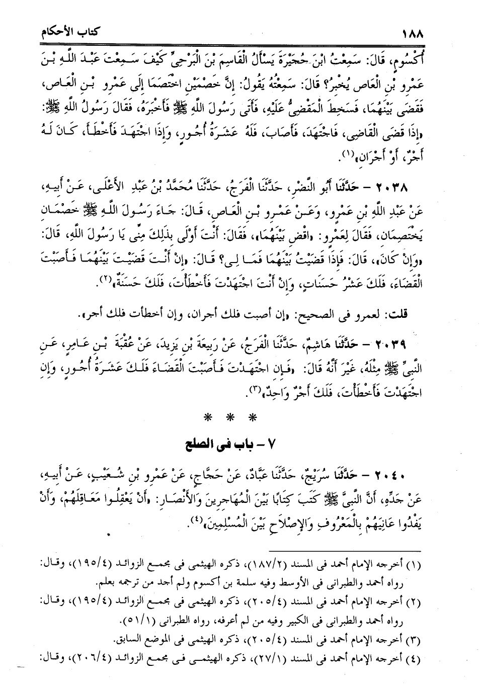 2038 - حَدَّثَنَا أَبُو النَّضْرِ، حَدَّثَنَا الْفَرَجُ، حَدَّثَنَا مُحَمَّدُ بْنُ عَبْدِ الأَعْلَى، عَنْ أَبِيهِ، عَنْ عَبْدِ اللَّهِ بْنِ عَمْرٍو، وَعَنْ عَمْرِو بْنِ الْعَاصِ، قَالَ: جَاءَ رَسُولَ اللَّهِ صلى الله عليه وسلم خَصْمَانِ يَخْتَصِمَانِ، فَقَالَ لِعَمْرٍو: "اقْضِ بَيْنَهُمَا، فَقَالَ: أَنْتَ أَوْلَى بِذَلِكَ مِنِّى يَا رَسُولَ اللَّهِ، قَالَ: "وَإِنْ كَانَ، قَالَ: فَإِذَا قَضَيْتُ بَيْنَهُمَا فَمَا لِى؟ قَالَ: "إِنْ أَنْتَ قَضَيْتَ بَيْنَهُمَا فَأَصَبْتَ الْقَضَاءَ، فَلَكَ عَشْرُ حَسَنَاتٍ، وَإِنْ أَنْتَ اجْتَهَدْتَ فَأَخْطَأْتَ، فَلَكَ حَسَنَةٌ.