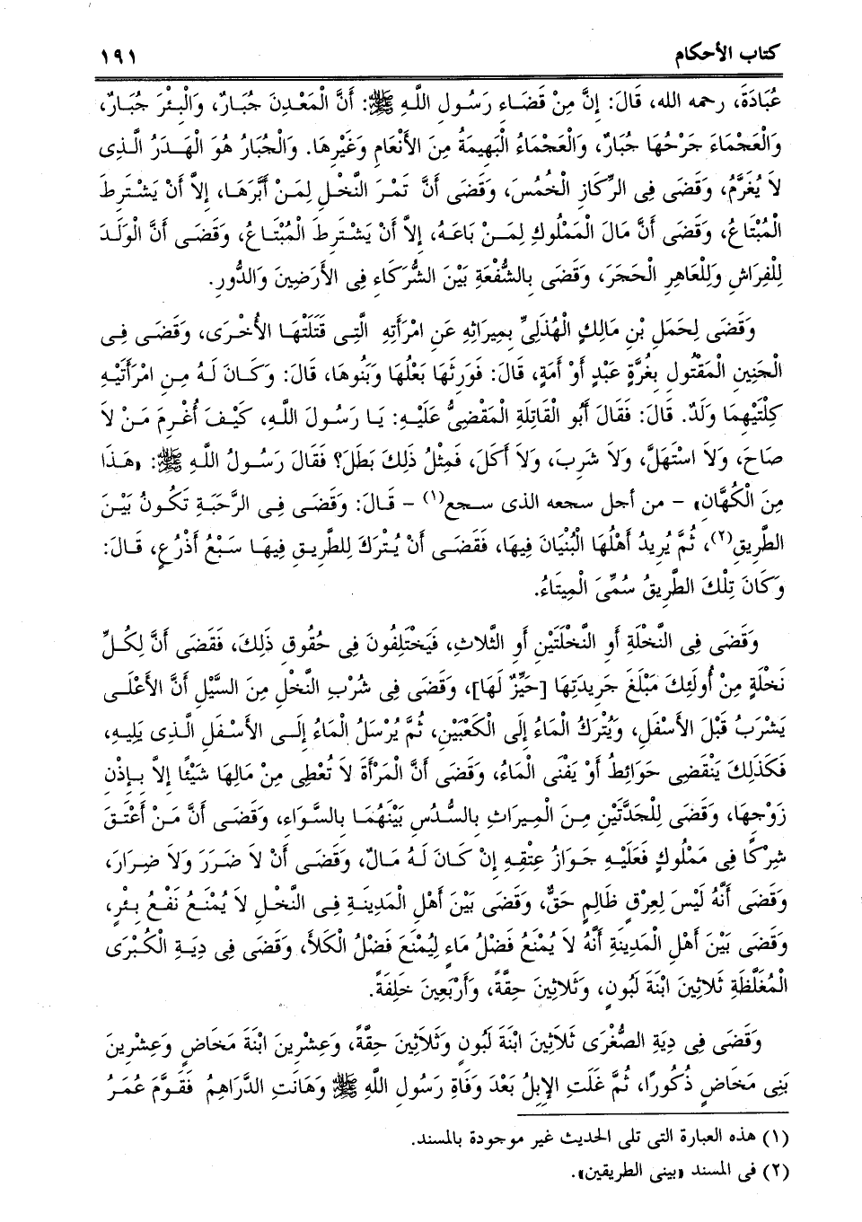 وَقَضَى فِى النَّخْلَةِ أَوِ النَّخْلَتَيْنِ أَوِ الثَّلاثِ، فَيَخْتَلِفُونَ فِى حُقُوقِ ذَلِكَ، فَقَضَى أَنَّ لِكُلِّ نَخْلَةٍ مِنْ أُولَئِكَ مَبْلَغَ جَرِيدَتِهَا [حَيِّزٌ لَهَا] ، وَقَضَى فِى شُرْبِ النَّخْلِ مِنَ السَّيْلِ أَنَّ الأَعْلَى يَشْرَبُ قَبْلَ الأَسْفَلِ، وَيُتْرَكُ الْمَاءُ إِلَى الْكَعْبَيْنِ، ثُمَّ يُرْسَلُ الْمَاءُ إِلَى الأَسْفَلِ الَّذِى يَلِيهِ، فَكَذَلِكَ يَنْقَضِى حَوَائِطُ أَوْ يَفْنَى الْمَاءُ، وَقَضَى أَنَّ الْمَرْأَةَ لاَ تُعْطِى مِنْ مَالِهَا شَيْئًا إِلاَّ بِإِذْنِ زَوْجِهَا، وَقَضَى لِلْجَدَّتَيْنِ مِنَ الْمِيرَاثِ بِالسُّدُسِ بَيْنَهُمَا بِالسَّوَاءِ، وَقَضَى أَنَّ مَنْ أَعْتَقَ شِرْكًا فِى مَمْلُوكٍ فَعَلَيْهِ جَوَازُ عِتْقِهِ إِنْ كَانَ لَهُ مَالٌ، وَقَضَى أَنْ لاَ ضَرَرَ وَلاَ ضِرَارَ، وَقَضَى أَنَّهُ لَيْسَ لِعِرْقٍ ظَالِمٍ حَقٌّ، وَقَضَى بَيْنَ أَهْلِ الْمَدِينَةِ فِى النَّخْلِ لاَ يُمْنَعُ نَفْعُ بِئْرٍ، وَقَضَى بَيْنَ أَهْلِ الْمَدِينَةِ أَنَّهُ لاَ يُمْنَعُ فَضْلُ مَاءٍ لِيُمْنَعَ فَضْلُ الْكَلأَ، وَقَضَى فِى دِيَةِ الْكُبْرَى الْمُغَلَّظَةِ ثَلاثِينَ ابْنَةَ لَبُونٍ، وَثَلاثِينَ حِقَّةً، وَأَرْبَعِينَ خَلِفَةً.