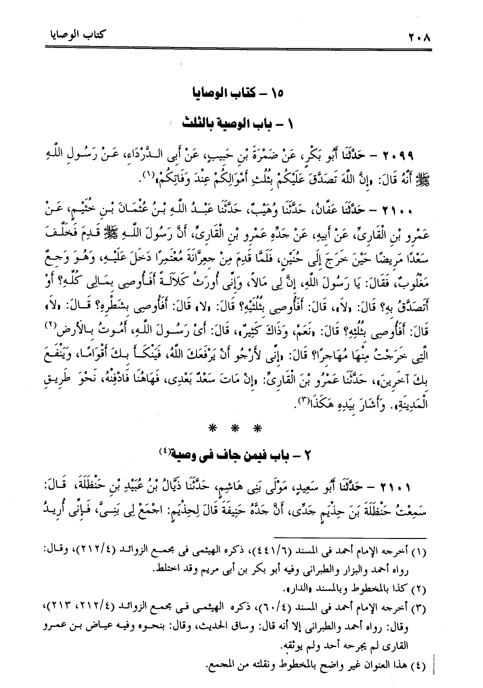 2100 - حَدَّثَنَا عَفَّانُ، حَدَّثَنَا وُهَيْبٌ، حَدَّثَنَا عَبْدُ اللَّهِ بْنُ عُثْمَانَ بْنِ خُثَيْمٍ، عَنْ عَمْرِو بْنِ الْقَارِىِّ، عَنْ أَبِيهِ، عَنْ جَدِّهِ عَمْرِو بْنِ الْقَارِىِّ، أَنَّ رَسُولَ اللَّهِ صلى الله عليه وسلم قَدِمَ فَخَلَّفَ سَعْدًا مَرِيضًا حَيْنَ خَرَجَ إِلَى حُنَيْنٍ، فَلَمَّا قَدِمَ مِنْ جِعِرَّانَةَ مُعْتَمِرًا دَخَلَ عَلَيْهِ، وَهُوَ وَجِعٌ مَغْلُوبٌ، فَقَالَ: يَا رَسُولَ اللَّهِ، إِنَّ لِى مَالاً، وَإِنِّى أُورَثُ كَلاَلَةً أَفَأُوصِى بِمَالِى كُلِّهِ؟ أَوْ أَتَصَدَّقُ بِهِ؟ قَالَ: "لاَ، قَالَ: أَفَأُوصِى بِثُلُثَيْهِ؟ قَالَ: "لا قَالَ: أَفَأُوصِى بِشَطْرِهِ؟ قَالَ: "لاَ قَالَ: أَفَأُوصِى بِثُلُثِهِ؟ قَالَ: "نَعَمْ، وَذَاكَ كَثِيرٌ، قَالَ: أَىْ رَسُولَ اللَّهِ، أَمُوتُ بِالأرض الَّتِى خَرَجْتُ مِنْهَا مُهَاجِرًا؟ قَالَ: "إِنِّى لأَرْجُو أَنْ يَرْفَعَكَ اللَّهُ، فَيَنْكَأَ بِكَ أَقْوَامًا، وَيَنْفَعَ بِكَ آخَرِينَ، حَدَّثَنَا عَمْرُو بْنَ الْقَارِىِّ: "إِنْ مَاتَ سَعْدٌ بَعْدِى، فَهَاهُنَا فَادْفِنْهُ، نَحْوَ طَرِيقِ الْمَدِينَةِ. وَأَشَارَ بِيَدِهِ هَكَذَا.