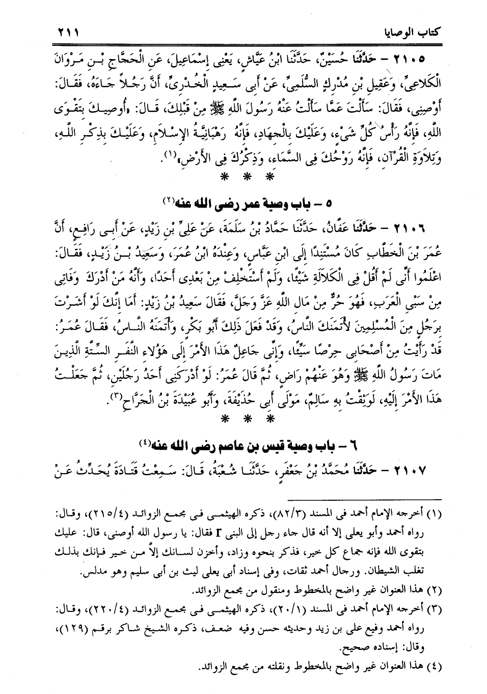 2107 - حَدَّثَنَا مُحَمَّدُ بْنُ جَعْفَرٍ، حَدَّثَنَا شُعْبَةُ، قَالَ: سَمِعْتُ قَتَادَةَ يُحَدِّثُ عَنْ -[212]- مُطَرِّفِ بْنِ الشِّخِّيرِ (ح) وَحَجَّاجٌ، قَالَ: حَدَّثَنِى شُعْبَةُ، سَمِعْتُ مُطَرِّفَ بْنَ الشِّخِّيرِ، يُحَدِّثُ عَنْ حَكِيمِ بْنِ قَيْسِ بْنِ عَاصِمٍ، عَنْ أَبِيهِ، أَنَّهُ أَوْصَى وَلَدَهُ عِنْدَ مَوْتِهِ، قَالَ: اتَّقُوا اللَّهَ عَزَّ وَجَلَّ، وَسَوِّدُوا أَكْبَرَكُمْ، فَإِنَّ الْقَوْمَ إِذَا سَوَّدُوا أَكْبَرَهُمْ، خَلَفُوا أَبَاهُمْ، فَذَكَرَ الْحَدِيثَ.
