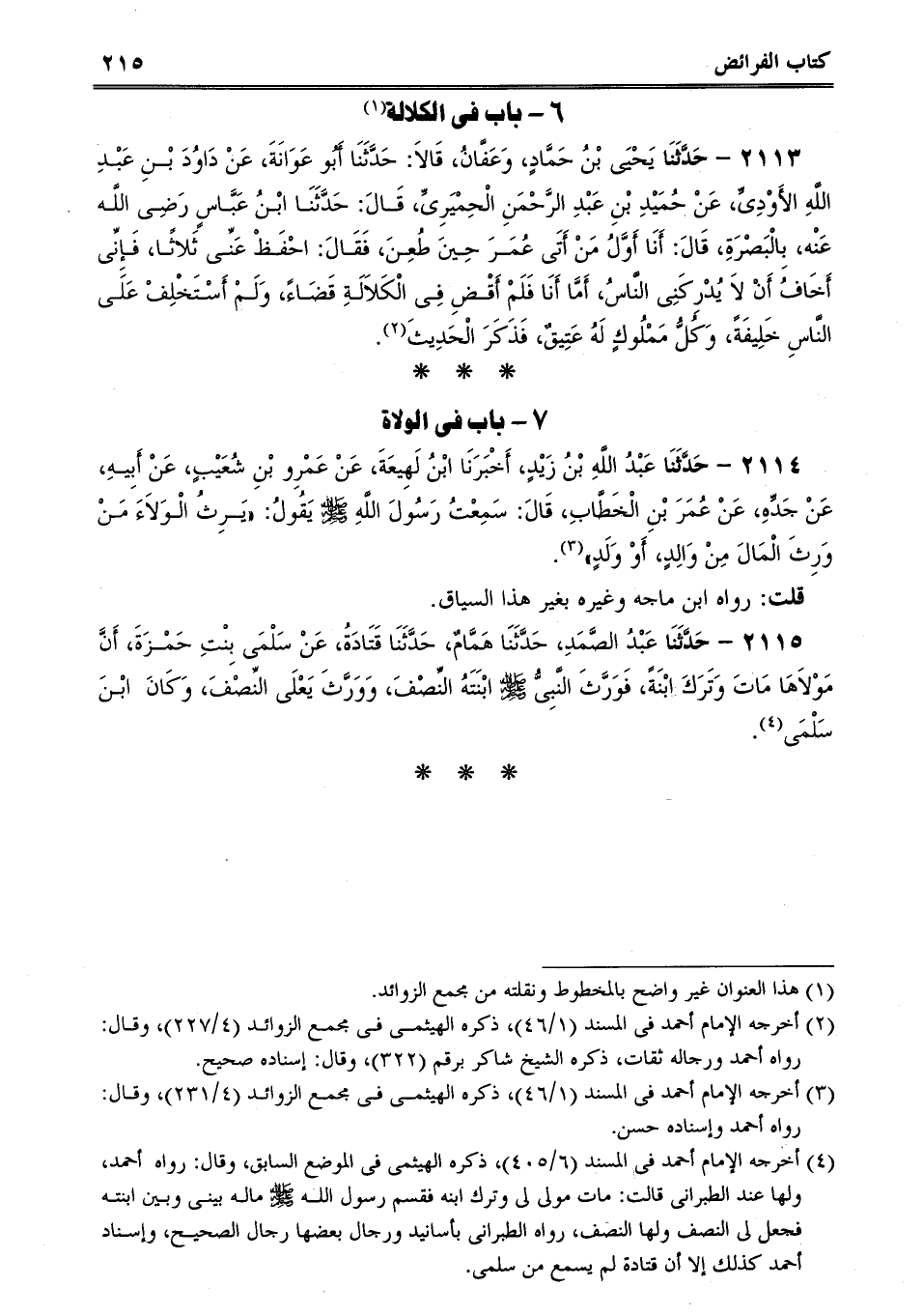 2113 - حَدَّثَنَا يَحْيَى بْنُ حَمَّادٍ، وَعَفَّانُ، قَالاَ: حَدَّثَنَا أَبُو عَوَانَةَ، عَنْ دَاوُدَ بْنِ عَبْدِ اللَّهِ الأَوْدِىِّ، عَنْ حُمَيْدِ بْنِ عَبْدِ الرَّحْمَنِ الْحِمْيَرِىِّ، قَالَ: حَدَّثَنَا ابْنُ عَبَّاسٍ رَضِى اللَّه عَنْه، بِالْبَصْرَةِ، قَالَ: أَنَا أَوَّلُ مَنْ أَتَى عُمَرَ حِينَ طُعِنَ، فَقَالَ: احْفَظْ عَنِّى ثَلاثًا، فَإِنِّى أَخَافُ أَنْ لاَ يُدْرِكَنِى النَّاسُ، أَمَّا أَنَا فَلَمْ أَقْضِ فِى الْكَلاَلَةِ قَضَاءً، وَلَمْ أَسْتَخْلِفْ عَلَى النَّاسِ خَلِيفَةً، وَكُلُّ مَمْلُوكٍ لَهُ عَتِيقٌ، فَذَكَرَ الْحَدِيثَ.