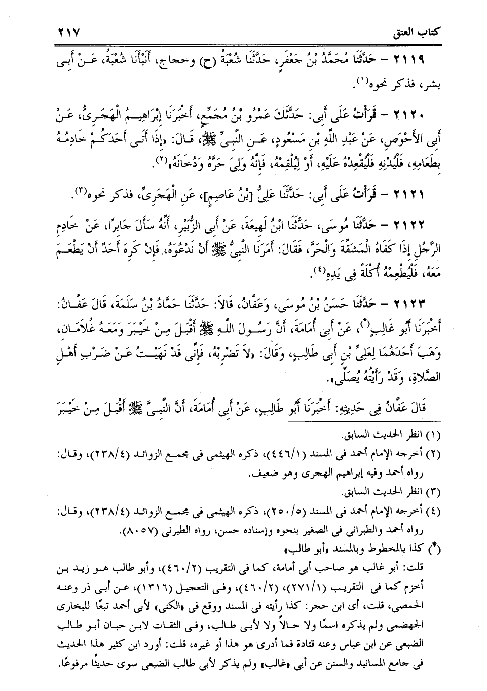 قَالَ عَفَّانُ فِى حَدِيثِهِ: أَخْبَرَنَا أَبُو طَالِبٍ، عَنْ أَبِى أُمَامَةَ، أَنَّ النَّبِىَّ صلى الله عليه وسلم أَقْبَلَ مِنْ خَيْبَرَ -[218]- وَمَعَهُ غُلاَمَانِ، فَقَالَ عَلِىٌّ: يَا رَسُولَ اللَّهِ، أَخْدِمْنَا؟ قَالَ: "خُذْ أَيَّهُمَا شِئْتَ، قَالَ: خِرْ لِى، قَالَ: "خُذْ هَذَا، وَلاَ تَضْرِبْهُ، فَإِنِّى قَدْ رَأَيْتُهُ يُصَلِّى مَقْبَلَنَا مِنْ خَيْبَرَ، وَإِنِّى قَدْ نَهَيْتُ. وَأَعْطَى أَبَا ذَرٍّ غُلاَمًا، وَقَالَ: "اسْتَوْصِ بِهِ مَعْرُوفًا، فَأَعْتَقَهُ، فَقَالَ لَهُ النَّبِىُّ صلى الله عليه وسلم: "مَا فَعَلَ الْغُلامُ؟ قَالَ: يَا رَسُولَ اللَّهِ، أَمَرْتَنِى أَنْ أَسْتَوْصِىَ بِهِ مَعْرُوفًا، فَأَعْتَقْتُهُ.