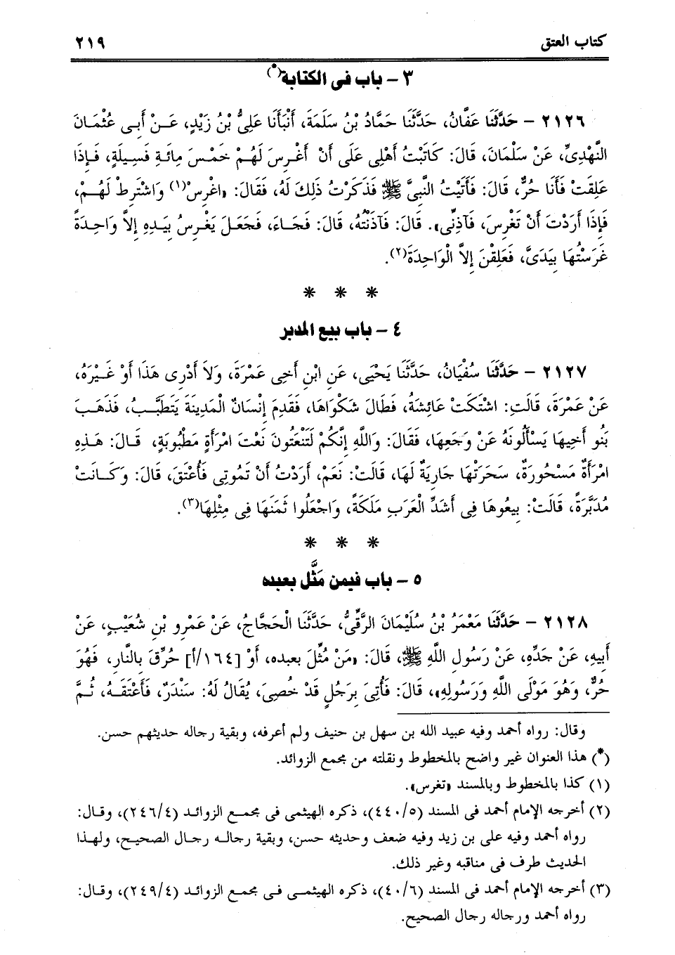 2126 - حَدَّثَنَا عَفَّانُ، حَدَّثَنَا حَمَّادُ بْنُ سَلَمَةَ، أَنْبَأَنَا عَلِىُّ بْنُ زَيْدٍ، عَنْ أَبِى عُثْمَانَ النَّهْدِىِّ، عَنْ سَلْمَانَ، قَالَ: كَاتَبْتُ أَهْلِى عَلَى أَنْ أَغْرِسَ لَهُمْ خَمْسَ مِائَةِ فَسِيلَةٍ، فَإِذَا عَلِقَتْ فَأَنَا حُرٌّ، قَالَ: فَأَتَيْتُ النَّبِىَّ صلى الله عليه وسلم فَذَكَرْتُ ذَلِكَ لَهُ، فَقَالَ: "اغْرِسْ وَاشْتَرِطْ لَهُمْ، فَإِذَا أَرَدْتَ أَنْ تَغْرِسَ، فَآذِنِّى. قَالَ: فَآذَنْتُهُ، قَالَ: فَجَاءَ، فَجَعَلَ يَغْرِسُ بِيَدِهِ إِلاَّ وَاحِدَةً غَرَسْتُهَا بِيَدَىَّ، فَعَلِقْنَ إِلاَّ الْوَاحِدَةَ.