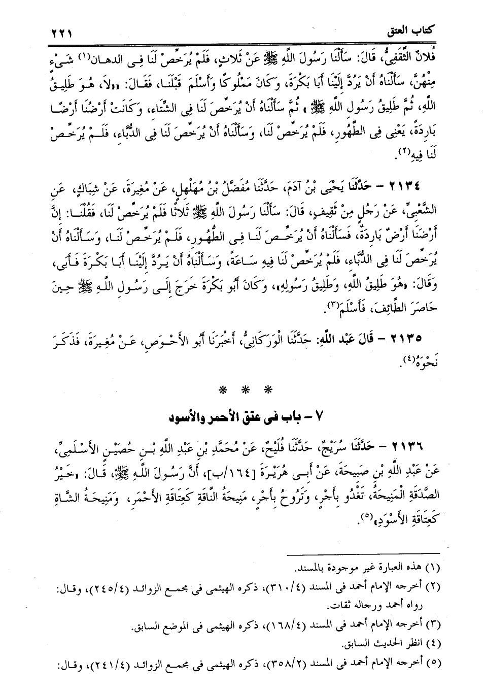 2134 - حَدَّثَنَا يَحْيَى بْنُ آدَمَ، حَدَّثَنَا مُفَضَّلُ بْنُ مُهَلْهِلٍ، عَنْ مُغِيرَةَ، عَنْ شِبَاكٍ، عَنِ الشَّعْبِىِّ، عَنْ رَجُلٍ مِنْ ثَقِيفٍ، قَالَ: سَأَلْنَا رَسُولَ اللَّهِ صلى الله عليه وسلم ثَلاثًا فَلَمْ يُرَخِّصْ لَنَا، فَقُلْنَا: إِنَّ أَرْضَنَا أَرْضٌ بَارِدَةٌ، فَسَأَلْنَاهُ أَنْ يُرَخِّصَ لَنَا فِى الطُّهُورِ، فَلَمْ يُرَخِّصْ لَنَا، وَسَأَلْنَاهُ أَنْ يُرَخِّصَ لَنَا فِى الدُّبَّاءِ، فَلَمْ يُرَخِّصْ لَنَا فِيهِ سَاعَةً، وَسَأَلْنَاهُ أَنْ يَرُدَّ إِلَيْنَا أَبَا بَكْرَةَ فَأَبَى، وَقَالَ: "هُوَ طَلِيقُ اللَّهِ، وَطَلِيقُ رَسُولِهِ، وَكَانَ أَبُو بَكْرَةَ خَرَجَ إِلَى رَسُولِ اللَّهِ صلى الله عليه وسلم حِينَ حَاصَرَ الطَّائِفَ، فَأَسْلَمَ.