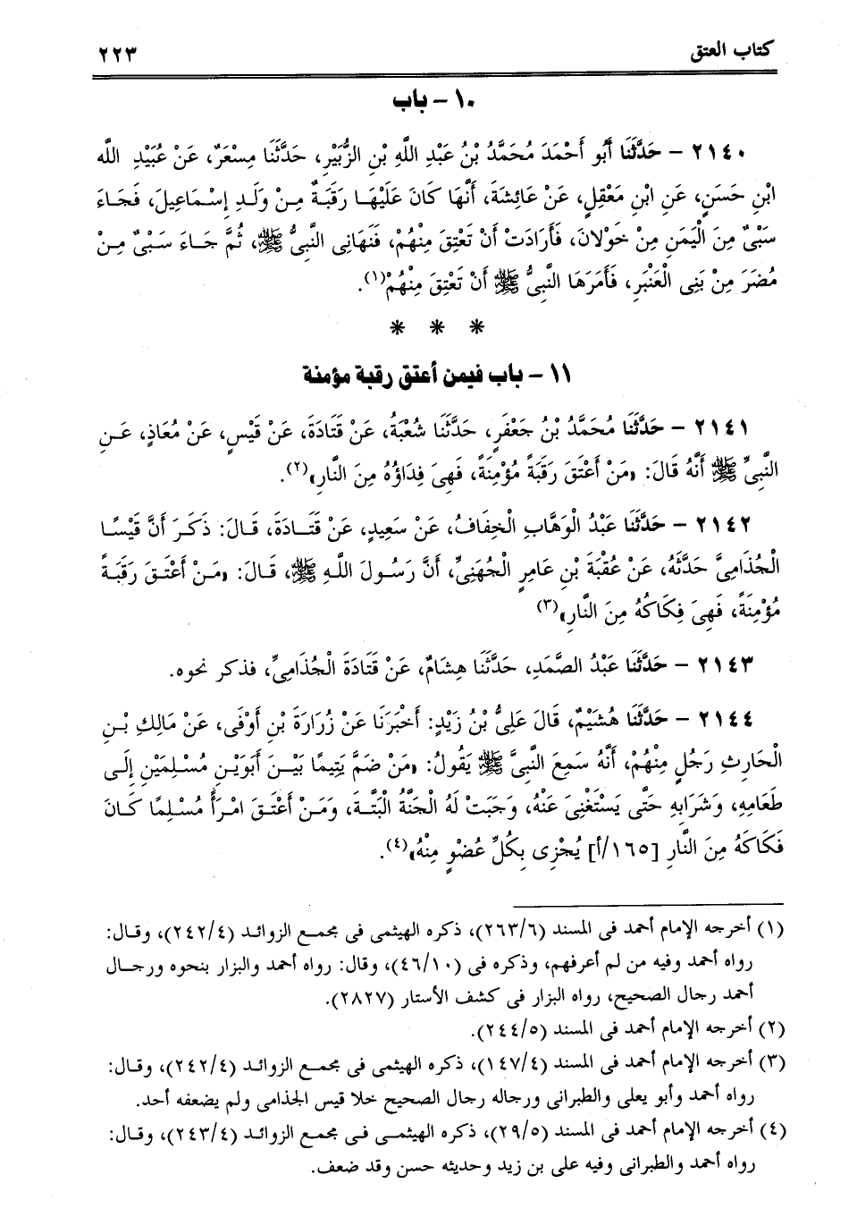 2144 - حَدَّثَنَا هُشَيْمٌ، قَالَ عَلِىُّ بْنُ زَيْدٍ: أَخْبَرَنَا عَنْ زُرَارَةَ بْنِ أَوْفَى، عَنْ مَالِكِ بْنِ الْحَارِثِ رَجُلٍ مِنْهُمْ، أَنَّهُ سَمِعَ النَّبِىَّ صلى الله عليه وسلم يَقُولُ: "مَنْ ضَمَّ يَتِيمًا بَيْنَ أَبَوَيْنِ مُسْلِمَيْنِ إِلَى طَعَامِهِ، وَشَرَابِهِ حَتَّى يَسْتَغْنِىَ عَنْهُ، وَجَبَتْ لَهُ الْجَنَّةُ الْبَتَّةَ، وَمَنْ أَعْتَقَ امْرَأً مُسْلِمًا كَانَ فَكَاكَهُ مِنَ النَّارِ يُجْزِى بِكُلِّ عُضْوٍ مِنْهُ.