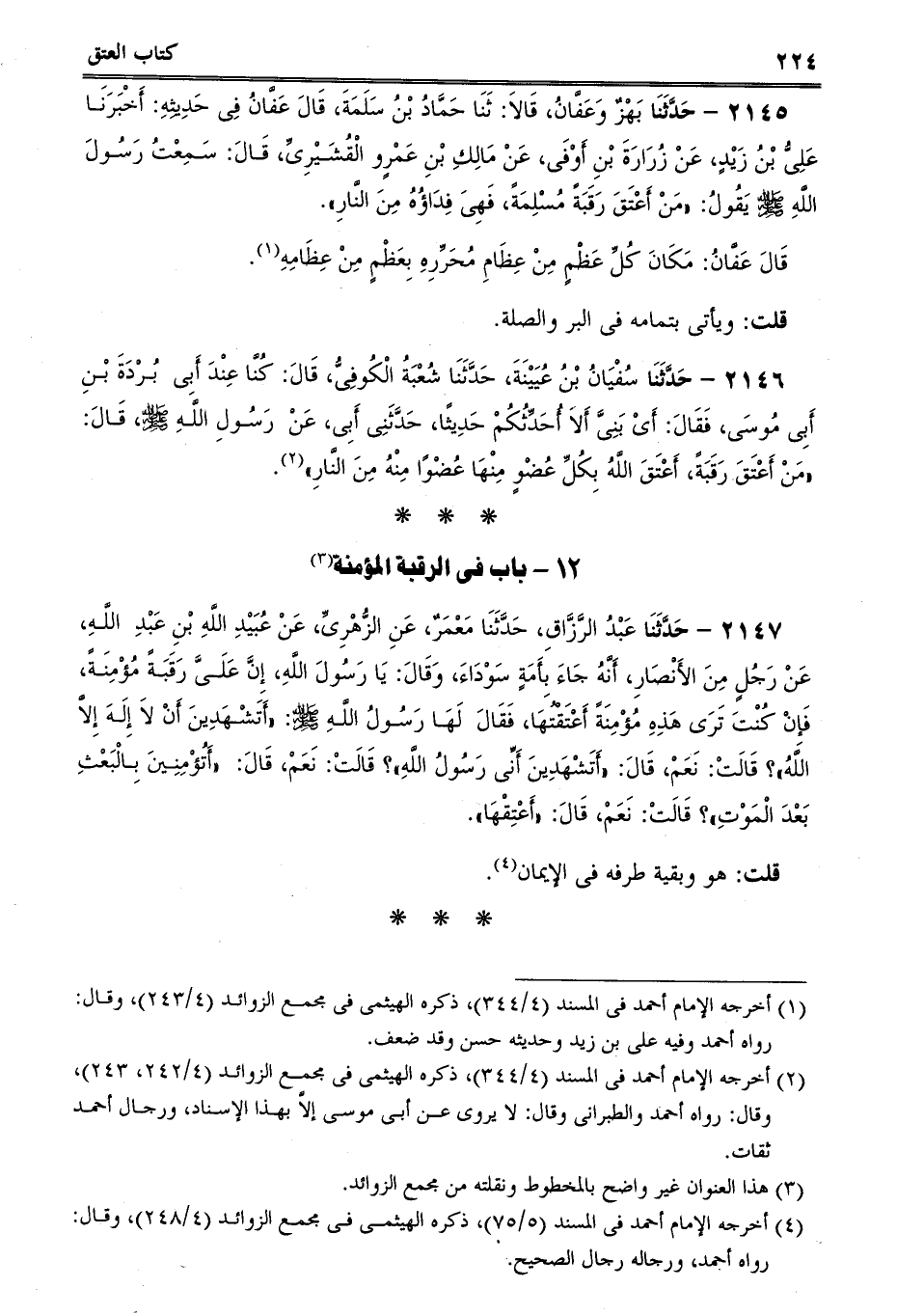 2145 - حَدَّثَنَا بَهْزٌ وَعَفَّانُ، قَالاَ: ثَنَا حَمَّادُ بْنُ سَلَمَةَ، قَالَ عَفَّانُ فِى حَدِيثِهِ: أَخْبَرَنَا عَلِىُّ بْنُ زَيْدٍ، عَنْ زُرَارَةَ بْنِ أَوْفَى، عَنْ مَالِكِ بْنِ عَمْرٍو الْقُشَيْرِىِّ، قَالَ: سَمِعْتُ رَسُولَ اللَّهِ صلى الله عليه وسلم يَقُولُ: "مَنْ أَعْتَقَ رَقَبَةً مُسْلِمَةً، فَهِىَ فِدَاؤُهُ مِنَ النَّارِ.