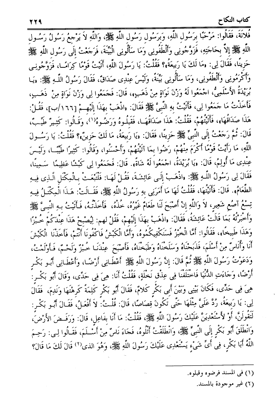 بِحَاجَتِهِ، فَزَوَّجُونِى وَأَلْطَفُونِى وَمَا سَأَلُونِى الْبَيِّنَةَ، فَرَجَعْتُ إِلَى رَسُولِ اللَّهِ صلى الله عليه وسلم حَزِينًا، فَقَالَ لِى: "مَا لَكَ يَا رَبِيعَةُ؟ فَقُلْتُ: يَا رَسُولَ اللَّهِ، أَتَيْتُ قَوْمًا كِرَامًا، فَزَوَّجُونِى وَأَكْرَمُونِى وَأَلْطَفُونِى، وَمَا سَأَلُونِى بَيِّنَةً، وَلَيْسَ عِنْدِى صَدَاقٌ، فَقَالَ رَسُولُ اللَّهِ صلى الله عليه وسلم: "يَا بُرَيْدَةُ الأَسْلَمِىُّ، اجْمَعُوا لَهُ وَزْنَ نَوَاةٍ مِنْ ذَهَبٍ، قَالَ: فَجَمَعُوا لِى وَزْنَ نَوَاةٍ مِنْ ذَهَبٍ، فَأَخَذْتُ مَا جَمَعُوا لِى، فَأَتَيْتُ بِهِ النَّبِىَّ صلى الله عليه وسلم فَقَالَ: "اذْهَبْ بِهَذَا إِلَيْهِمْ، فَقُلْ: هَذَا صَدَاقُهَا، فَأَتَيْتُهُمْ، فَقُلْتُ: هَذَا صَدَاقُهَا، فَقَبِلُوهُ وَرَضُوهُ، وَقَالُوا: كَثِيرٌ طَيِّبٌ، قَالَ: ثُمَّ رَجَعْتُ إِلَى النَّبِىِّ صلى الله عليه وسلم حَزِينًا، فَقَالَ: "يَا رَبِيعَةُ، مَا لَكَ حَزِينٌ؟ فَقُلْتُ: يَا رَسُولَ اللَّهِ، مَا رَأَيْتُ قَوْمًا أَكْرَمَ مِنْهُمْ، رَضُوا بِمَا آتَيْتُهُمْ، وَأَحْسَنُوا، وَقَالُوا: كَثِيرًا طَيِّبًا، وَلَيْسَ عِنْدِى مَا أُولِمُ، قَالَ: "يَا بُرَيْدَةُ، اجْمَعُوا لَهُ شَاةً. قَالَ: فَجَمَعُوا لِى كَبْشًا عَظِيمًا سَمِينًا، فَقَالَ لِى رَسُولُ اللَّهِ صلى الله عليه وسلم: "اذْهَبْ إِلَى عَائِشَةَ، فَقُلْ لَهَا: فَلْتَبْعَثْ بِالْمِكْتَلِ الَّذِى فِيهِ الطَّعَامُ. قَالَ: فَأَتَيْتُهَا، فَقُلْتُ لَهَا مَا أَمَرَنِى بِهِ رَسُولُ اللَّهِ صلى الله عليه وسلم، فَقَالَتْ: هَذَا الْمِكْتَلُ فِيهِ تِسْعُ آصُعِ شَعِيرٍ، لاَ وَاللَّهِ إِنْ أَصْبَحَ لَنَا طَعَامٌ غَيْرُهُ، خُذْهُ، فَأَخَذْتُهُ، فَأَتَيْتُ بِهِ النَّبِىَّ صلى الله عليه وسلم وَأَخْبَرْتُهُ بَمَا قَالَتْ عَائِشَةُ، فَقَالَ: "اذْهَبْ بِهَذَا إِلَيْهِمْ،