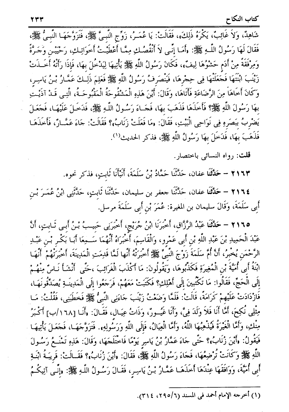 2165 - حَدَّثَنَا عَبْدُ الرَّزَّاقِ، أَخْبَرَنَا ابْنُ جُرَيْجٍ، أَخْبَرَنِى حَبِيبُ بْنُ أَبِى ثَابِتٍ، أَنَّ عَبْدَ الْحَمِيدِ بْنَ عَبْدِ اللَّهِ بْنِ أَبِى عَمْرٍو، وَالْقَاسِمَ، أَخْبَرَاهُ أَنَّهُمَا سَمِعَا أَبَا بَكْرِ بْنِ عَبْدِ الرَّحْمَنِ يُخْبِرُ، أَنَّ أُمَّ سَلَمَةَ زَوْجَ النَّبِىِّ صلى الله عليه وسلم أَخْبَرَتْهُ أَنَّها لَمَّا قَدِمَتِ الْمَدِينَةَ، أَخْبَرَتْهُمْ أَنَّهَا ابْنَةُ أَبِى أُمَيَّةَ بْنِ الْمُغِيرَةِ فَكَذَّبُوهَا، وَيَقُولُونَ: مَا أَكْذَبَ الْغَرَائِبَ، حَتَّى أَنْشَأَ نَاسٌ مِنْهُمْ إِلَى الْحَجِّ، فَقَالُوا: مَا تَكْتُبِينَ إِلَى أَهْلِكِ؟ فَكَتَبَتْ مَعَهُمْ، فَرَجَعُوا إِلَى الْمَدِينَةِ يُصَدِّقُونَهَا، فَازْدَادَتْ عَلَيْهِمْ كَرَامَةً، قَالَتْ: فَلَمَّا وَضَعْتُ زَيْنَبَ جَاءَنِى النَّبِىُّ صلى الله عليه وسلم فَخَطَبَنِى، فَقُلْتُ: مَا مِثْلِى نُكِحَ، أَمَّا أَنَا فَلاَ وَلَدَ فِىَّ، وَأَنَا غَيُورٌ، وَذَاتُ عِيَالٍ، فَقَالَ: "أَنَا أَكْبَرُ مِنْكِ، وَأَمَّا الْغَيْرَةُ فَيُذْهِبُهَا اللَّهُ، وَأَمَّا الْعِيَالُ، فَإِلَى اللَّهِ وَرَسُولِهِ. فَتَزَوَّجَهَا، فَجَعَلَ يَأْتِيهَا فَيَقُولُ: "أَيْنَ زُنَابُ؟ حَتَّى جَاءَ عَمَّارُ بْنُ يَاسِرٍ يَوْمًا فَاخْتَلَجَهَا، وَقَالَ: هَذِهِ تَمْنَعُ رَسُولَ اللَّهِ صلى الله عليه وسلم وَكَانَتْ تُرْضِعُهَا، فَجَاءَ رَسُولُ اللَّهِ صلى الله عليه وسلم، فَقَالَ: "أَيْنَ زُنَابُ؟ فَقَالَتْ: قَرِيبَةُ ابْنَةِ أَبِى أُمَيَّةَ، وَوَافَقَهَا عِنْدَهَا أَخَذَهَا عَمَّارُ بْنُ يَاسِرٍ، فَقَالَ رَسُولُ اللَّهِ صلى الله عليه وسلم: "إِنِّى آتِيكُمُ -[234]- اللَّيْلَةَ، قَالَتْ: فَقُمْتُ، فَأَخْرَجْتُ حَبَّاتٍ مِنْ شَعِيرٍ كَانَتْ فِى جَرٍّ، وَأَخْرَجْتُ شَحْمًا فَعَصَدْتُهُ لَهُ، قَالَتْ: فَبَاتَ النَّبِىُّ صلى الله