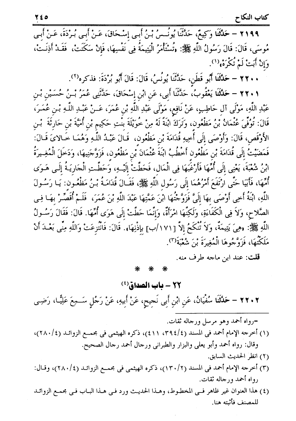 2201 - حَدَّثَنَا يَعْقُوبُ، حَدَّثَنَا أَبِى، عَنِ ابْنِ إِسْحَاقَ، حَدَّثَنِى عُمَرُ بْنُ حُسَيْنِ بْنِ عَبْدِ اللَّهِ، مَوْلَى آلِ حَاطِبٍ، عَنْ نَافِعٍ، مَوْلَى عَبْدِ اللَّهِ بْنِ عُمَرَ، عَنْ عَبْدِ اللَّهِ بْنِ عُمَرَ، قَالَ: تُوُفِّىَ عُثْمَانُ بْنُ مَظْعُونٍ، وَتَرَكَ ابْنَةً لَهُ مِنْ خُوَيْلَةَ بِنْتِ حَكِيمِ بْنِ أُمَيَّةَ بْنِ حَارِثَةَ بْنِ الأَوْقَصِ، قَالَ: وَأَوْصَى إِلَى أَخِيهِ قُدَامَةَ بْنِ مَظْعُونٍ، قَالَ عَبْدُ اللَّهِ وَهُمَا خَالاىَ قَالَ: فَمَضَيْتُ إِلَى قُدَامَةَ بْنِ مَظْعُونٍ أَخْطُبُ ابْنَةَ عُثْمَانَ بْنِ مَظْعُونٍ، فَزَوَّجَنِيهَا، وَدَخَلَ الْمُغِيرَةُ ابْنُ شُعْبَةَ، يَعْنِى إِلَى أُمِّهَا فَأَرْغَبَهَا فِى الْمَالِ، فَحَطَّتْ إِلَيْهِ، وَحَطَّتِ الْجَارِيَةُ إِلَى هَوَى أُمِّهَا، فَأَبَيَا حَتَّى ارْتَفَعَ أَمْرُهُمَا إِلَى رَسُولِ اللَّهِ صلى الله عليه وسلم، فَقَالَ قُدَامَةُ بْنُ مَظْعُونٍ: يَا رَسُولَ اللَّهِ، ابْنَةُ أَخِى أَوْصَى بِهَا إِلَىَّ فَزَوَّجْتُهَا ابْنَ عَمَّتِهَا عَبْدَ اللَّهِ بْنَ عُمَرَ، فَلَمْ أُقَصِّرْ بِهَا فِى الصَّلاحِ، وَلاَ فِى الْكَفَاءَةِ، وَلَكِنَّهَا امْرَأَةٌ، وَإِنَّمَا حَطَّتْ إِلَى هَوَى أُمِّهَا. قَالَ: فَقَالَ رَسُولُ اللَّهِ صلى الله عليه وسلم: "هِىَ يَتِيمَةٌ، وَلاَ تُنْكَحُ إِلاَّ بِإِذْنِهَا. قَالَ: فَانْتُزِعَتْ وَاللَّهِ مِنِّى بَعْدَ أَنْ مَلَكْتُهَا، فَزَوَّجُوهَا الْمُغِيرَةَ بْنَ شُعْبَةَ.