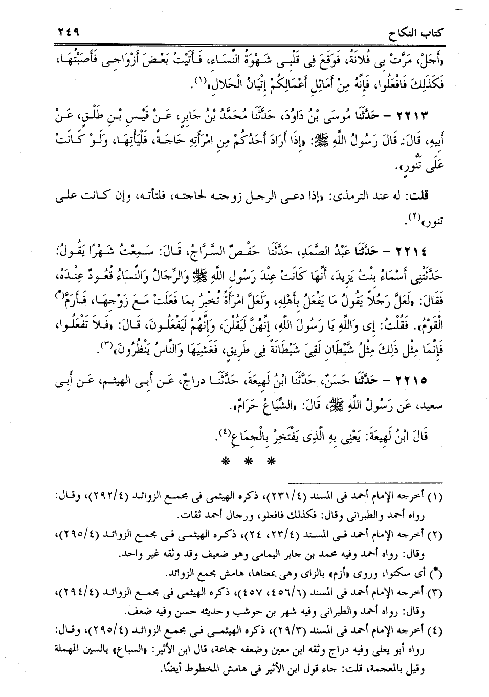 2213 - حَدَّثَنَا مُوسَى بْنُ دَاوُدَ، حَدَّثَنَا مُحَمَّدُ بْنُ جَابِرٍ، عَنْ قَيْسِ بْنِ طَلْقٍ، عَنْ أَبِيهِ، قَالَ: قَالَ رَسُولُ اللَّهِ صلى الله عليه وسلم: "إِذَا أَرَادَ أَحَدُكُمْ مِنِ امْرَأَتِهِ حَاجَةً، فَلْيَأْتِهَا، وَلَوْ كَانَتْ عَلَى تَنُّورٍ.