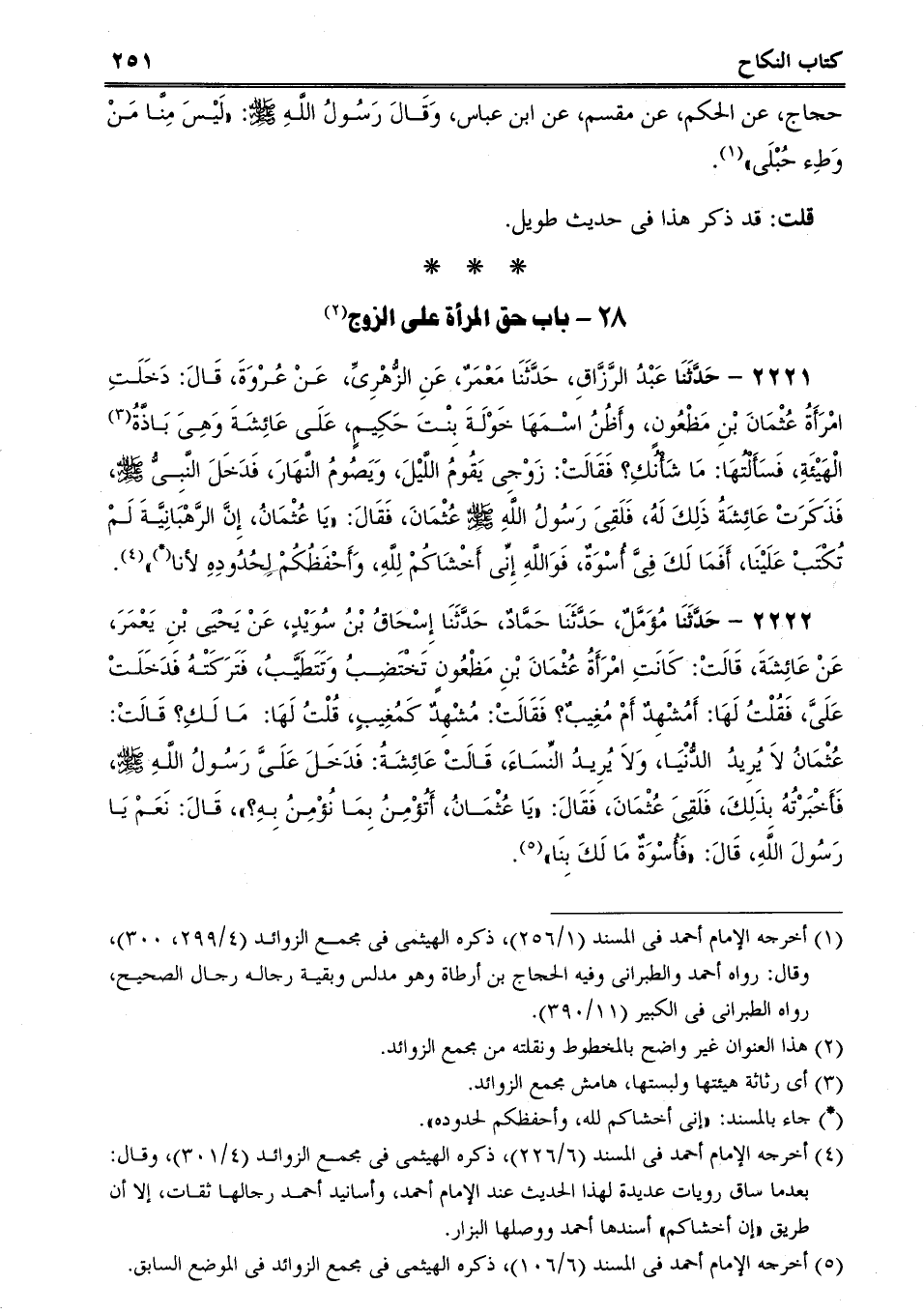 2222 - حَدَّثَنَا مُؤَمَّلٌ، حَدَّثَنَا حَمَّادٌ، حَدَّثَنَا إِسْحَاقُ بْنُ سُوَيْدٍ، عَنْ يَحْيَى بْنِ يَعْمَرَ، عَنْ عَائِشَةَ، قَالَتْ: كَانَتِ امْرَأَةُ عُثْمَانَ بْنِ مَظْعُونٍ تَخْتَضِبُ وَتَتَطَيَّبُ، فَتَرَكَتْهُ فَدَخَلَتْ عَلَىَّ، فَقُلْتُ لَهَا: أَمُشْهِدٌ أَمْ مُغِيبٌ؟ فَقَالَتْ: مُشْهِدٌ كَمُغِيبٍ، قُلْتُ لَهَا: مَا لَكِ؟ قَالَتْ: عُثْمَانُ لاَ يُرِيدُ الدُّنْيَا، وَلاَ يُرِيدُ النِّسَاءَ، قَالَتْ عَائِشَةُ: فَدَخَلَ عَلَىَّ رَسُولُ اللَّهِ صلى الله عليه وسلم، فَأَخْبَرْتُهُ بِذَلِكَ، فَلَقِىَ عُثْمَانَ، فَقَالَ: "يَا عُثْمَانُ، أَتُؤْمِنُ بِمَا نُؤْمِنُ بِهِ؟، قَالَ: نَعَمْ يَا رَسُولَ اللَّهِ، قَالَ: "فَأُسْوَةٌ مَا لَكَ بِنَا. -[252]-